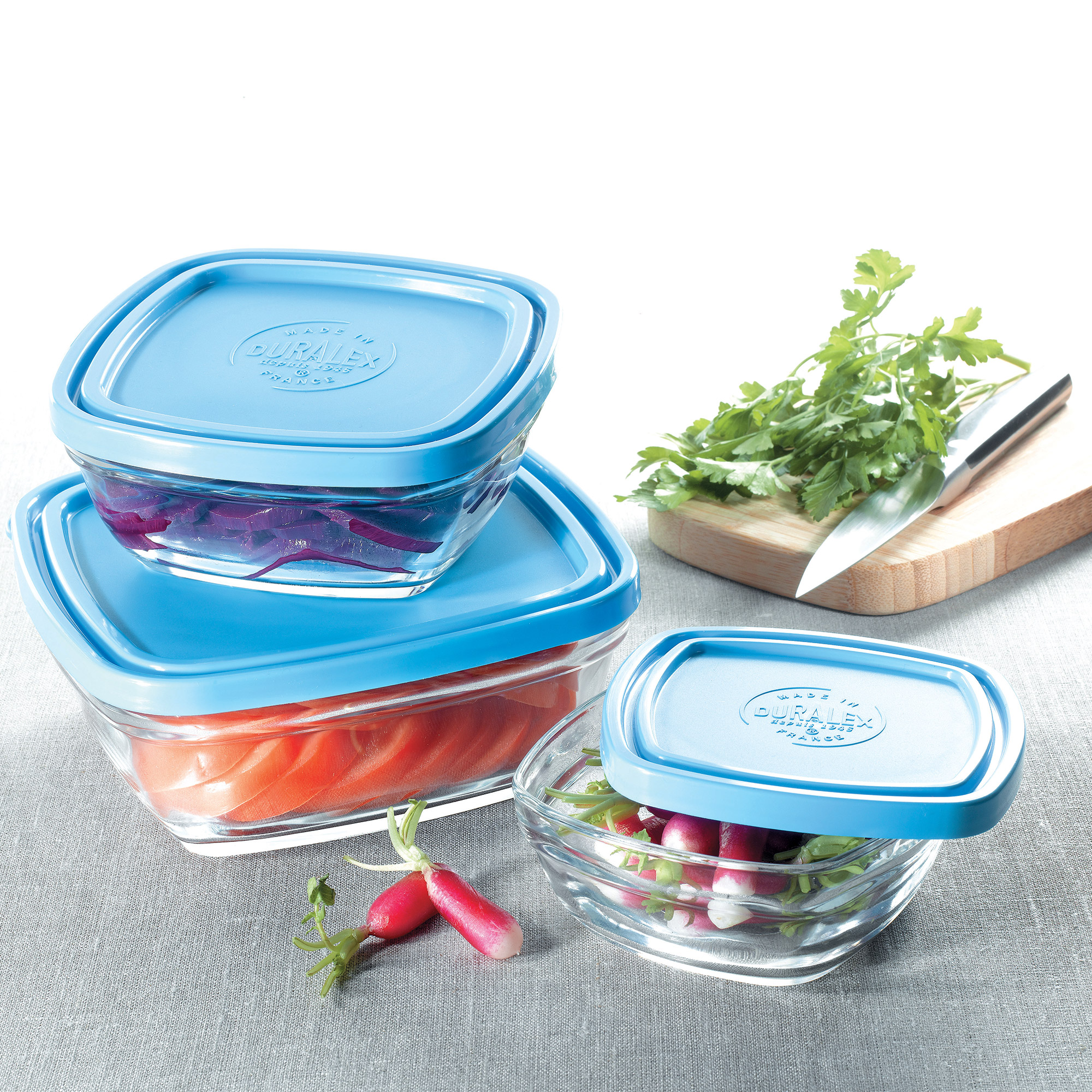 Lys Square Glass Bowls by Duralex are clear, stackable, and safe for dishwasher and microwave. Because they are both heat and cold resistant, they can go straight from the refrigerator to the microwave. Extremely durable tempered glass - impact and chip resistant, will not absorb taste or odors. Made in France. Plastic lids are BPA free and microwave/dishwasher safe. They can sustain temperatures from -4 degrees F to 158 degrees F.