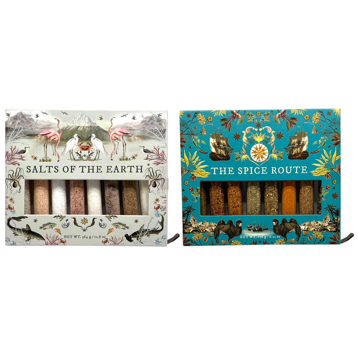 The 2-piece set includes 2 beautifully designed collections: the “Salts of the Earth” collection of 8 unique salts sourced from around the globe + “The Spice Route” collection of 8 exotic origin-based spice blends.
