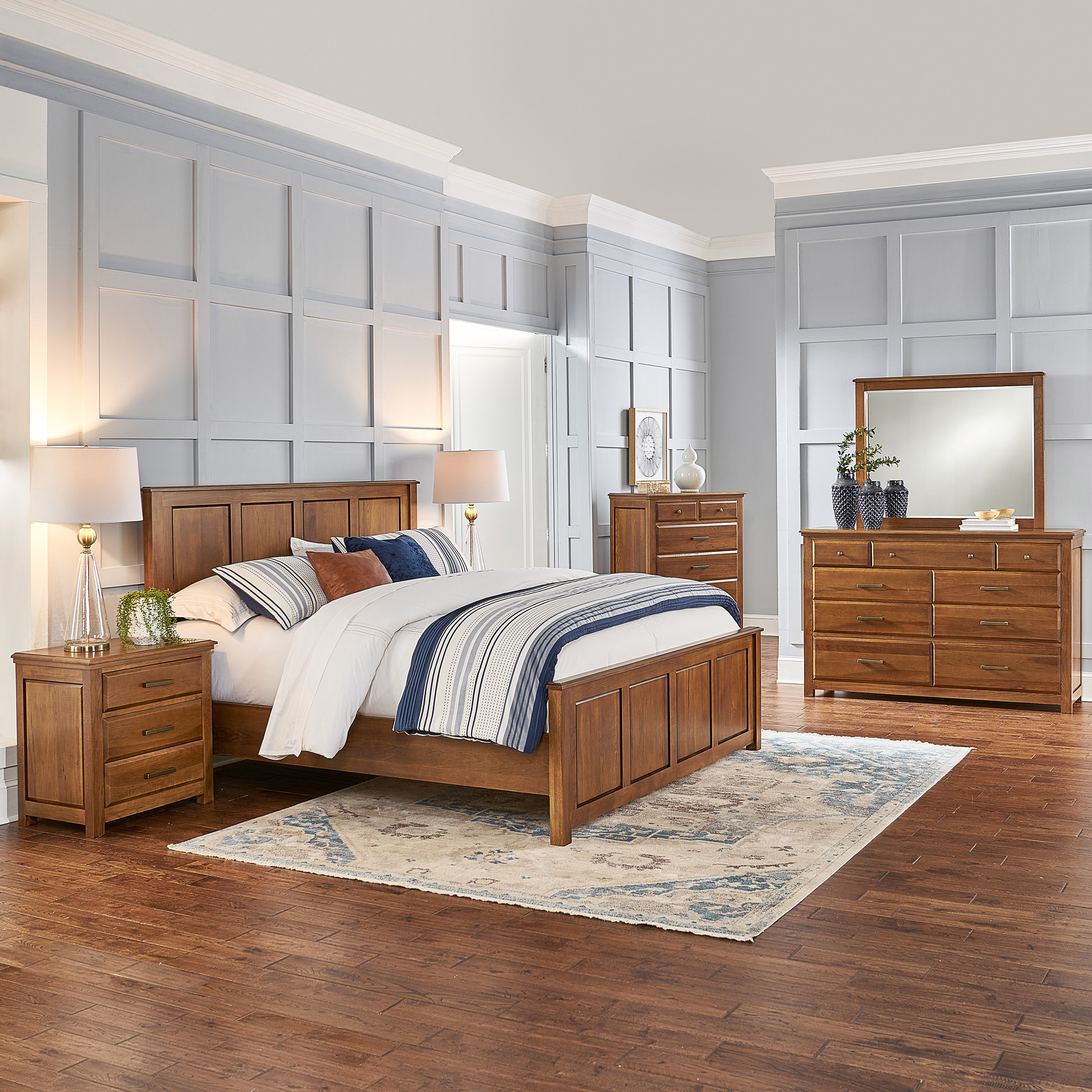 Constructed with sustainably sourced North American Hickory, the Fairmont 6pc King Bedroom Collection captures the creative spirit of elegant simplicity. This clean-lined transitional bedroom set is accented by the natural striations and unique variations of the multi-hued wood grain. The panel bed and case pieces are finished in warm hickory tones with satin brass hardware that creates an appealing and inviting feel. The Fairmont Collection features a USB charging station in the nightstand, full English dovetail joinery, felt-lined top drawers in all the case pieces and metal drawer glides, all these amenities offer quality craftsmanship and lasting beauty.