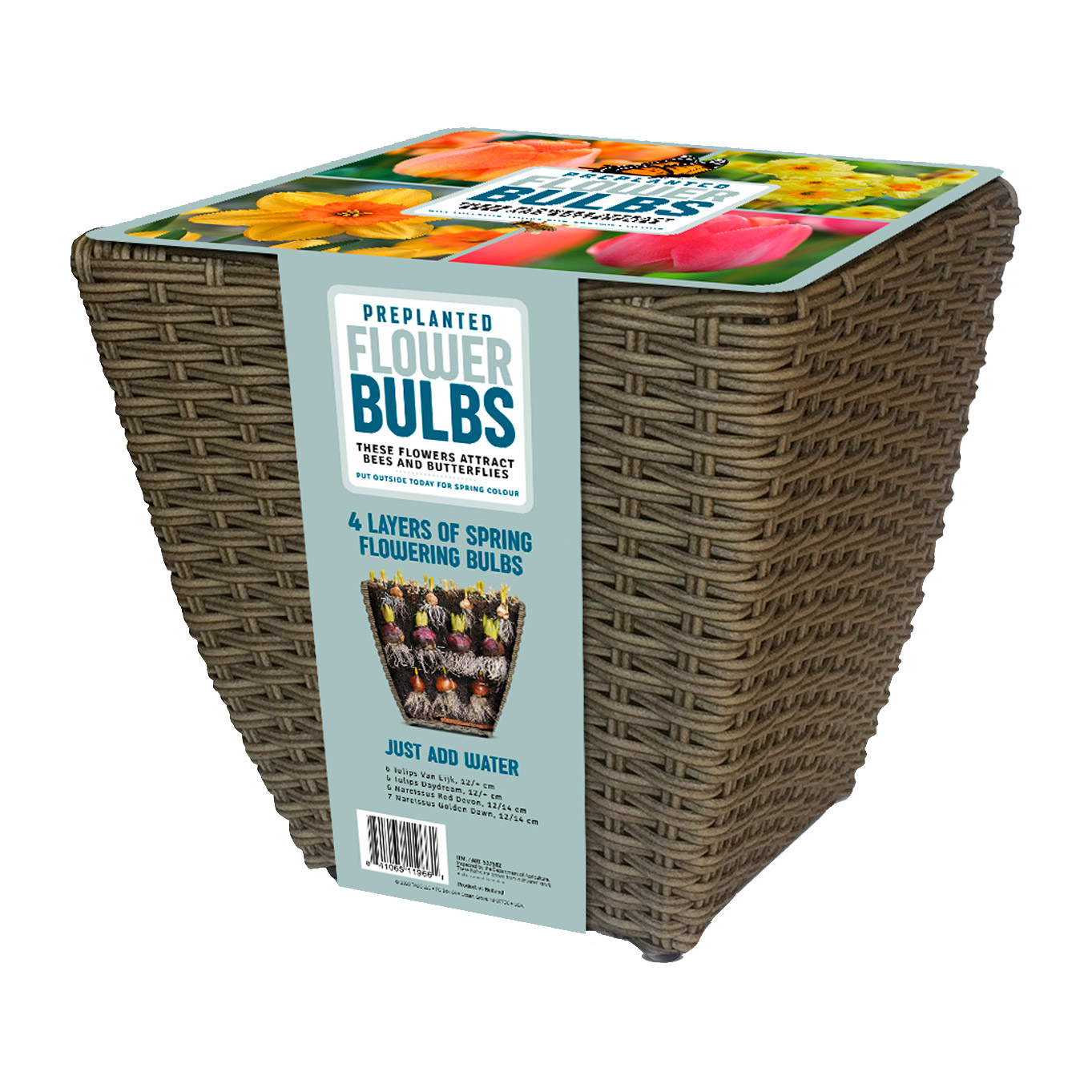 All the work is done! Just add water and put outside this fall for blooms in spring.Get excited for the first sign of spring – you will start to see growth in late winter / early spring. Attract bees and butterflies to your garden with 4 layers of pre-planted flower bulbs that will bloom in spring. Pre-planted bulbs are the easiest way to add spring color to your garden, patio, or balcony. 25 flower bulbs, each with different bloom times for long-lasting color.