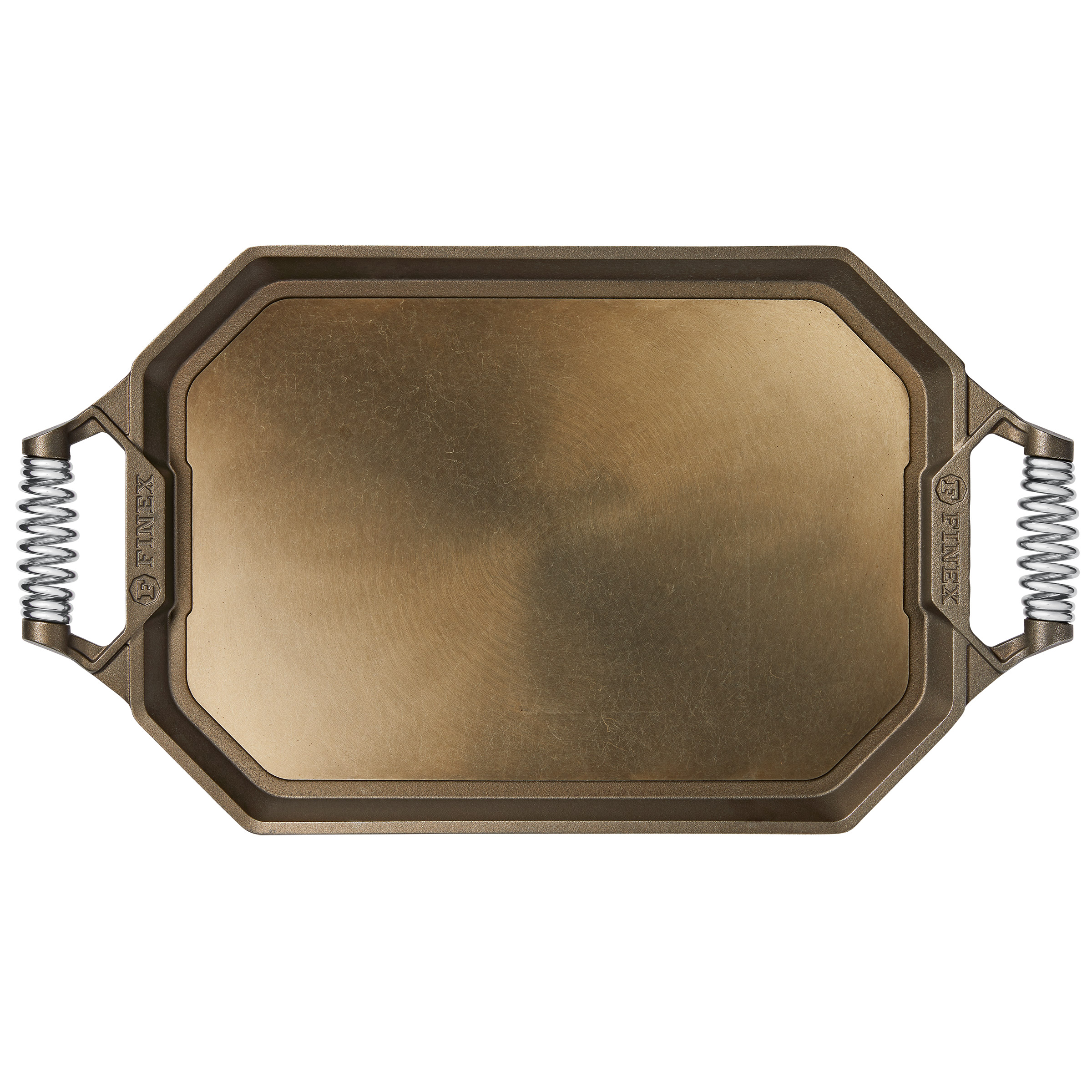 This Finex 18” Cast Iron Double Burner Griddle fits across most standard two burner stoves. Seasoned with 100% organic flaxseed oil for non-stick cooking and corrosion resistance. The hand polished and CNC machined surface makes for a smooth surface for easy cleaning and non-stick cooking. The heavy gauge cast iron evenly distributes heat.
