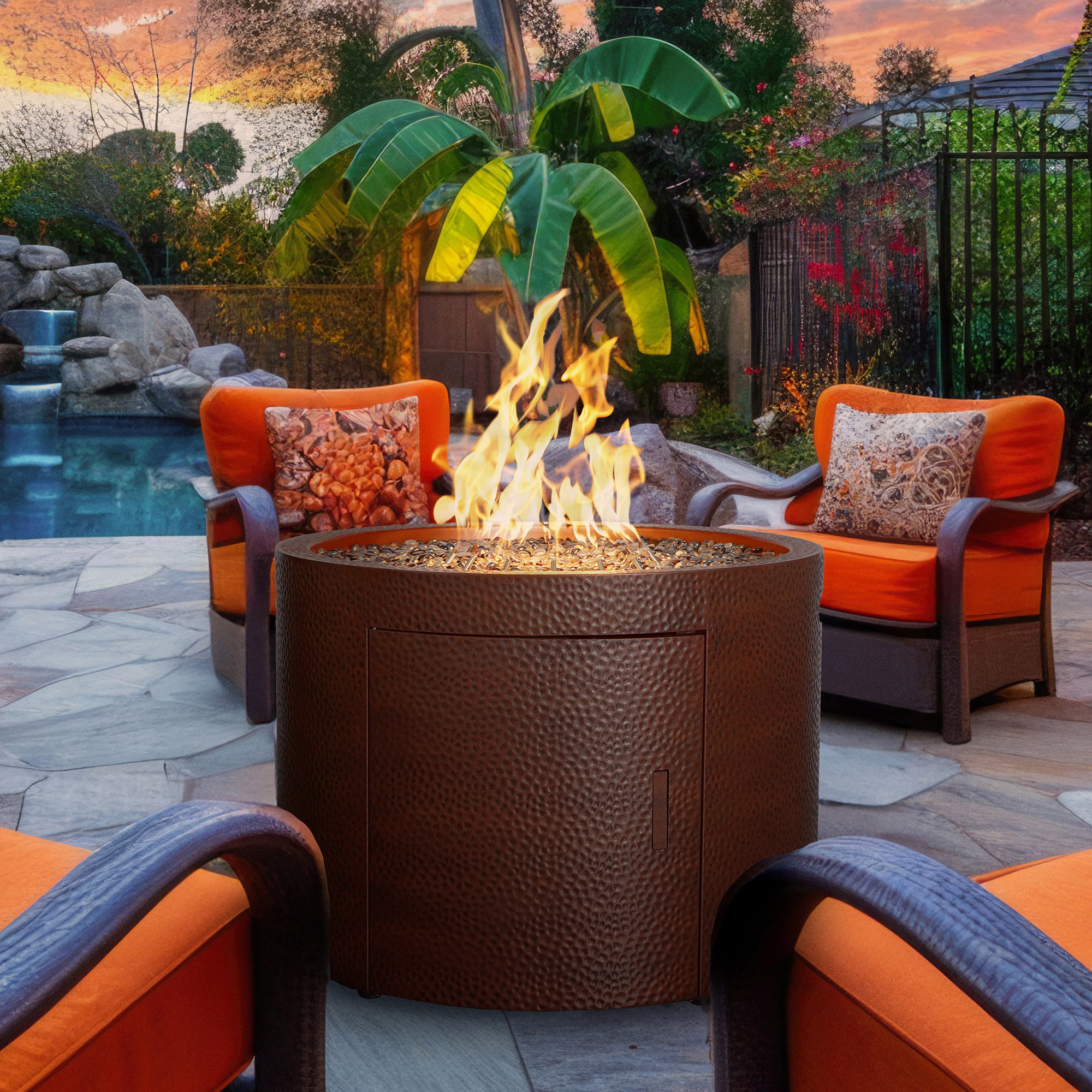 Set the scene for unforgettable nights with the warm, inviting flame of the FlamePro™ Hammertone Finish Gas Fire Pit with Lid. Gather your guests around the enchanting Amber & Clear LavaGlass® glow and embrace the cozy 10 ft. heat radius and 65,000 BTUs of warmth. Enjoy up to 6.5 hrs. of blissful ambiance, powered by a discreetly stored, roll-out 20 lb. propane tank. The sleek design of the concealed door latch, hidden control panel, and matching lid come together to create an elegant addition to your outdoor space.