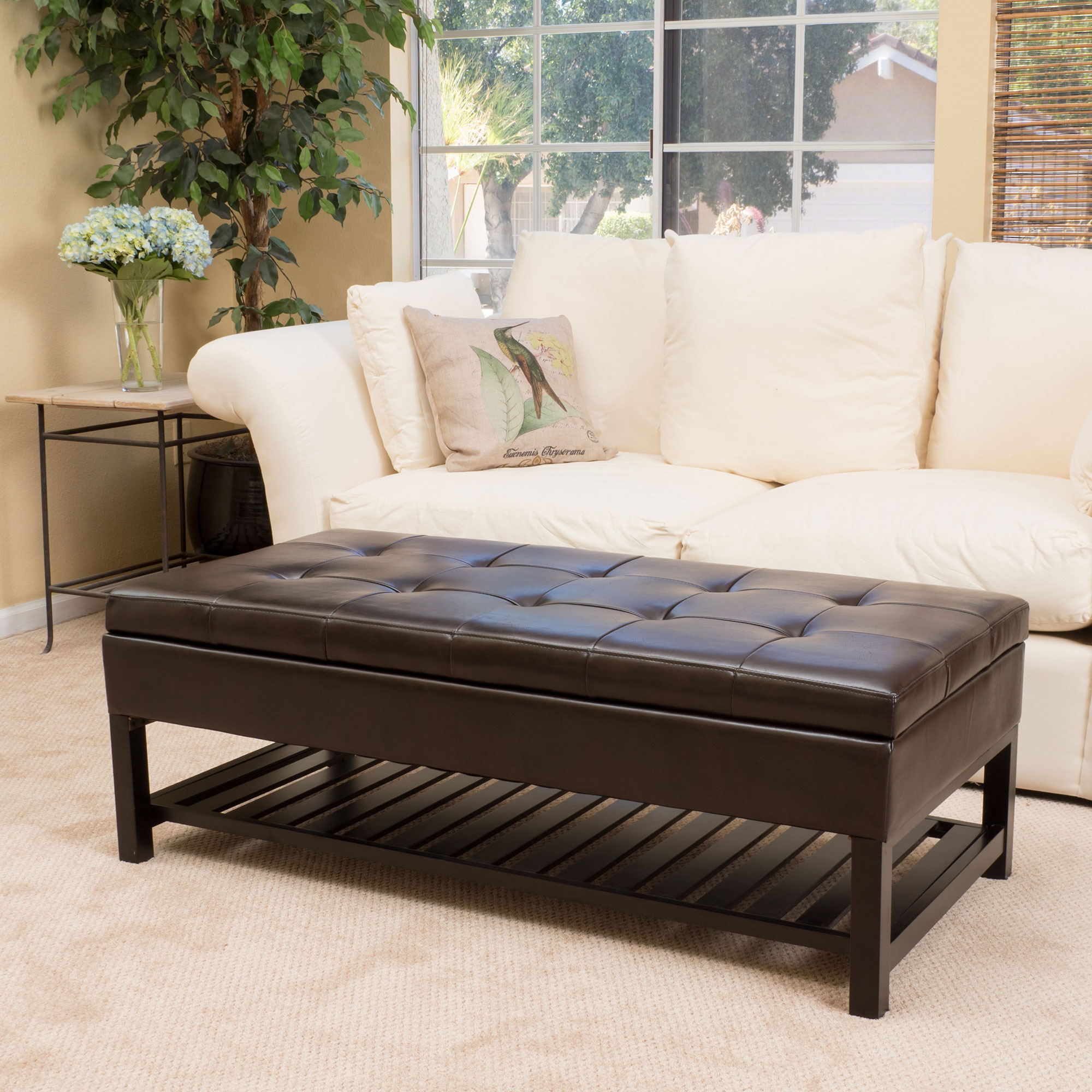 Function and style is exactly what you will get with the Fowler Bonded Leather Storage Bench. Supple Chocolate Brown Bonded Leather upholstery with top tufting will add style to any room. Open the top of the ottoman and you will find a nice storage compartment that is perfect for putting away books, blankets or anything else to keep the room tidy. Underneath the storage compartment you will find ample space for more storage with an open slatted shelf. The hardwood frame is finished in Espresso Brown and it will surely be the right fit for any space.Features: