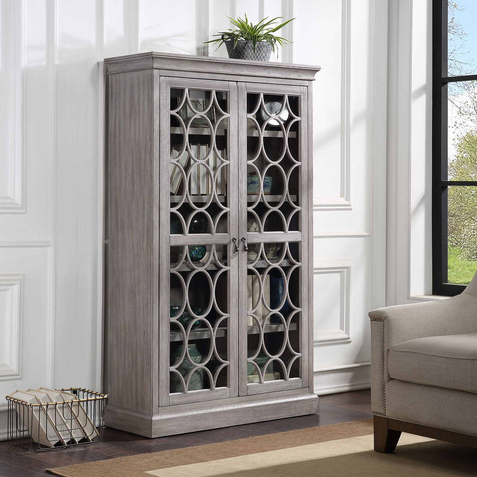 The Fremont collection blends traditional oval and diamond patterned fretwork with wire brushed blue, gray or white finish to create this casually elegant bookcase for the home. Antique pendent hardware adds a sophisticated jeweled touch.