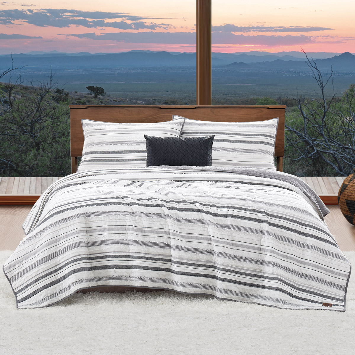 Paloma is a cotton quilt with jacquard yarn dye construction that has been pre-washed for extra softness. The clipped jacquard details provide dimension for the classic stripe design that coordinates with almost any décor. This set comes with a black embossed basketweave faux leather pillow. The FRYE company began in 1863 making hand made leather boots in Marlboro, MA, USA. The company has been dedicated to generations of FRYE artisans who are committed entirely to the art of craftmanship.