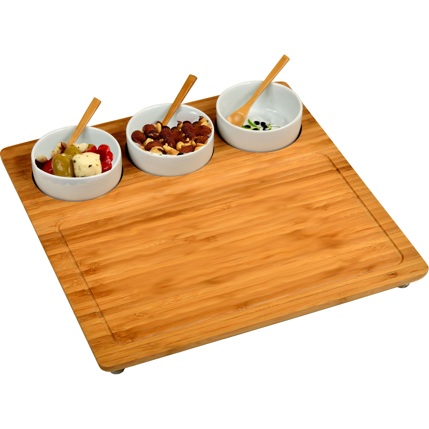 Beautifully designed serving board includes three inset ceramic dishes, three small bamboo spoons, and is roomy enough to function well at any event. Board features non slip feet on base and juice groove detail.