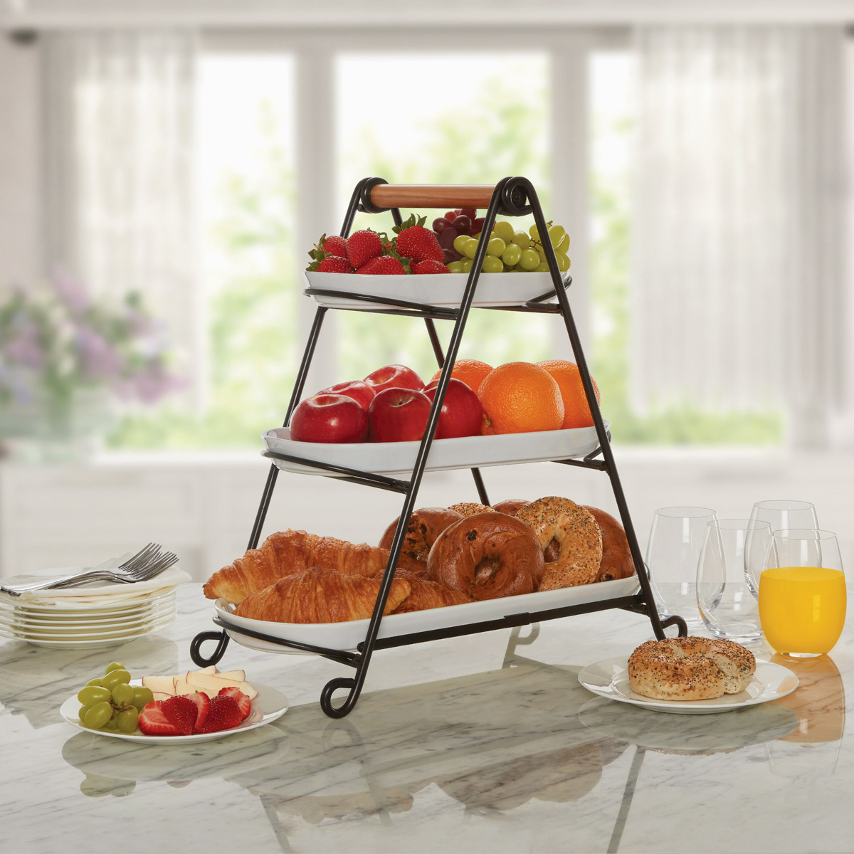 This 3-Tier Oval Server by Gourmet Basics allows you to serve more food while taking up less space on the table. Crafted of durable carbon steel with an antique black finish and an acacia wood handle for carrying convenience, the stand is an attractive way to present a variety of dishes to guests, making food visually appealing and easy to access. The stoneware plates have high walls to keep food from rolling off, and each plate is removable for individual use and easy cleaning. Stand folds for convenient, compact storage. Includes stand, 12-inch plate, 16-inch plate, and 20-inch plate. Microwave and dishwasher safe.