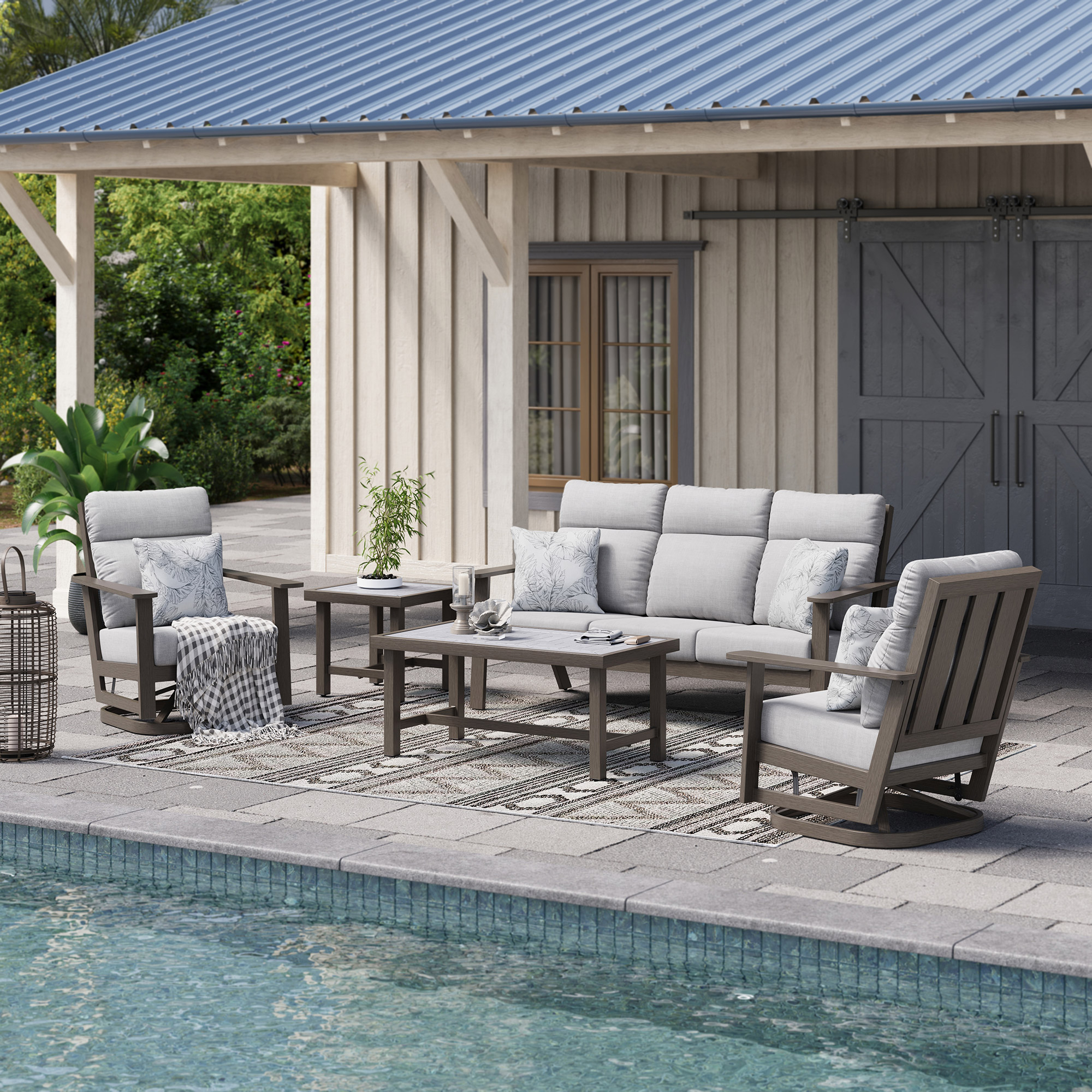 - Includes Two Swivel Glider Lounge Chairs, One Sofa, One Coffee Table and One Side Table