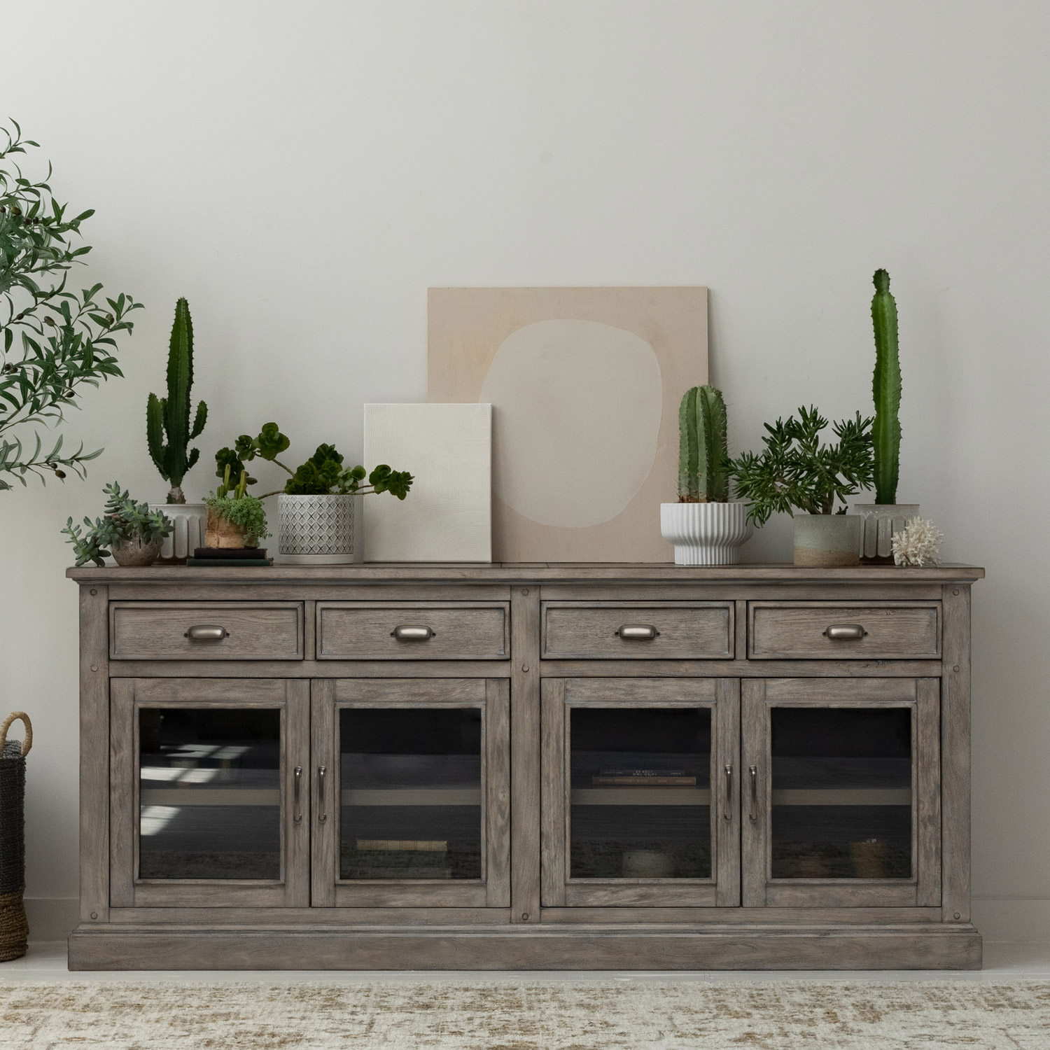 The Pike & Main Halladay Accent Console is constructed of mahogany solids with oak veneers and completed with a rustic multi-step finish. Organized with 4 drawers as well as lower cabinets, the console provides ample and flexible storage. Adjustable shelves and interchangeable door panels add easy customization, and integrated cord management helps organize the trappings of modern life. Thoughtfully detailed with decorative pegs and planked panels for a distinctive statement in any room.