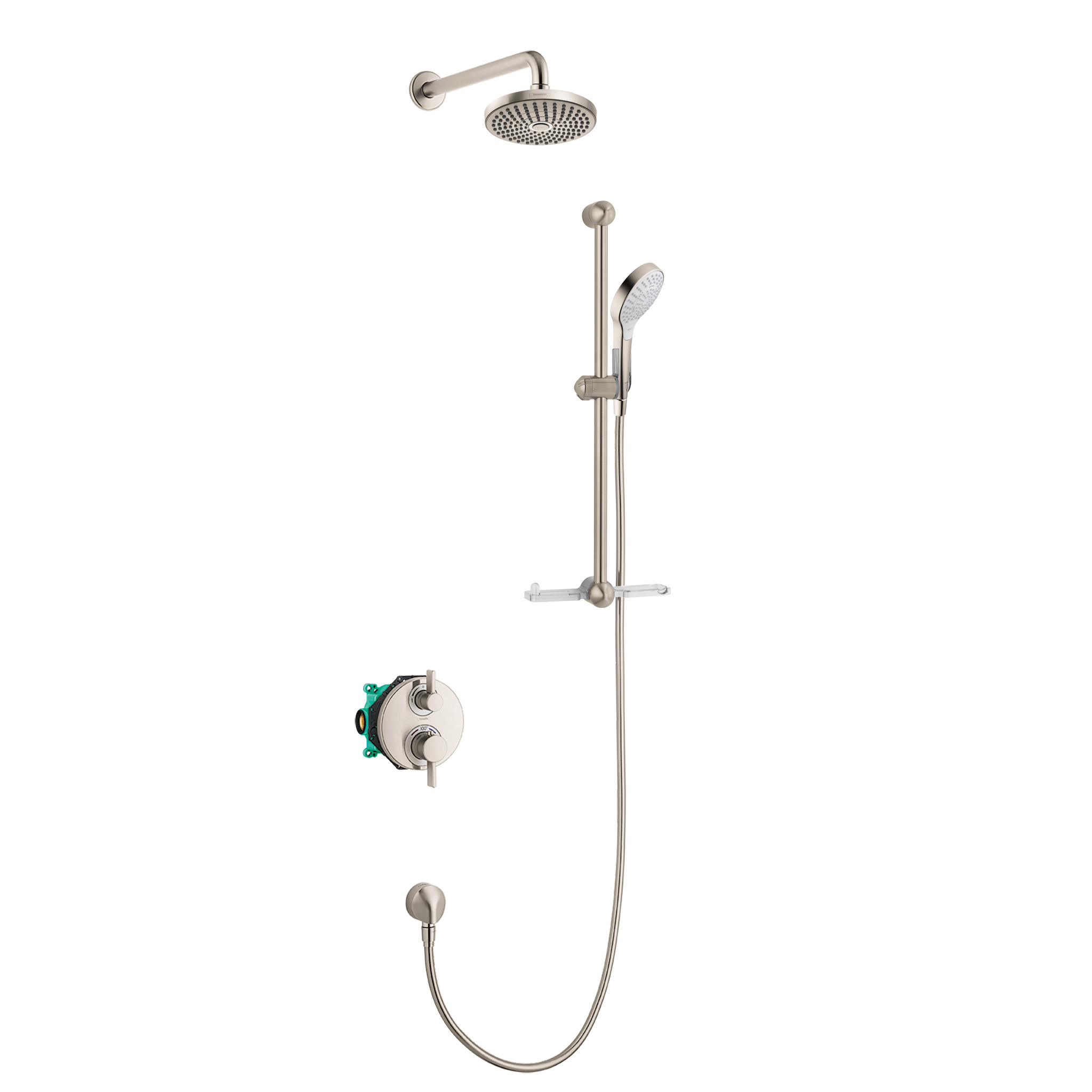 - Set Includes 7-inch Showerhead, Showerarm, Handshower, Wall Outlet, Wall Bar With Slider, Handshower Hose, Thermostatic Trim With Volume Control And Diverter, And iBox Rough Valve
