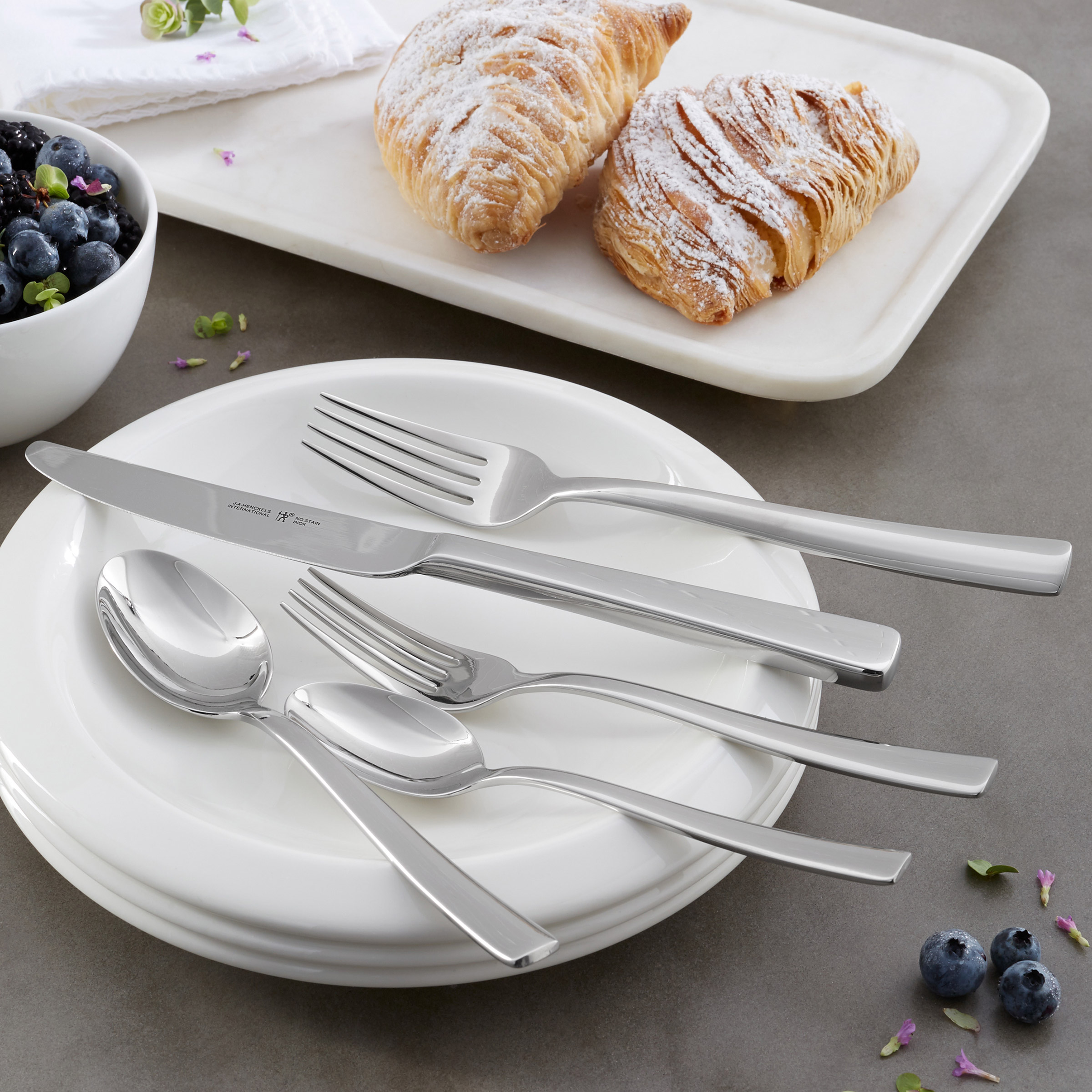 Contemporary, elegant design with distinctive standing knife.  Manufactured from the highest quality of 18/10 stainless steel, each piece is heavy gauged. The combination of 18% chrome and 10% nickel results in optimal corrosion resistance and high luster finish. Influenced by the expertise in fine cutlery craftsmanship, the Henckels International flatware collections feature unique handle designs, perfect balance, forged blades, and comfortable grip. Includes: