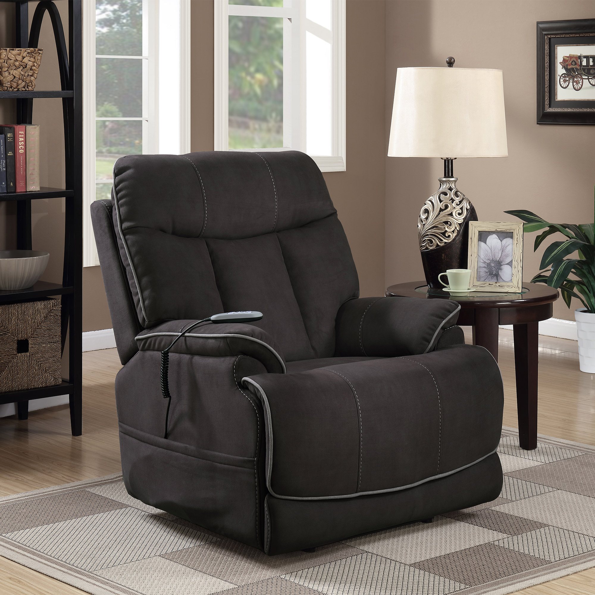 The Hercules Power Recliner is upholstered in a soft, faux suede in a deep Gray colorway with warm, Brown undertones. Its generous padding throughout offers a comforting embrace, while the drop-in pocket coil seating system offers uniform support. Contrast Light Gray welt and stitching adds the perfect finishing touch for that designer look.
