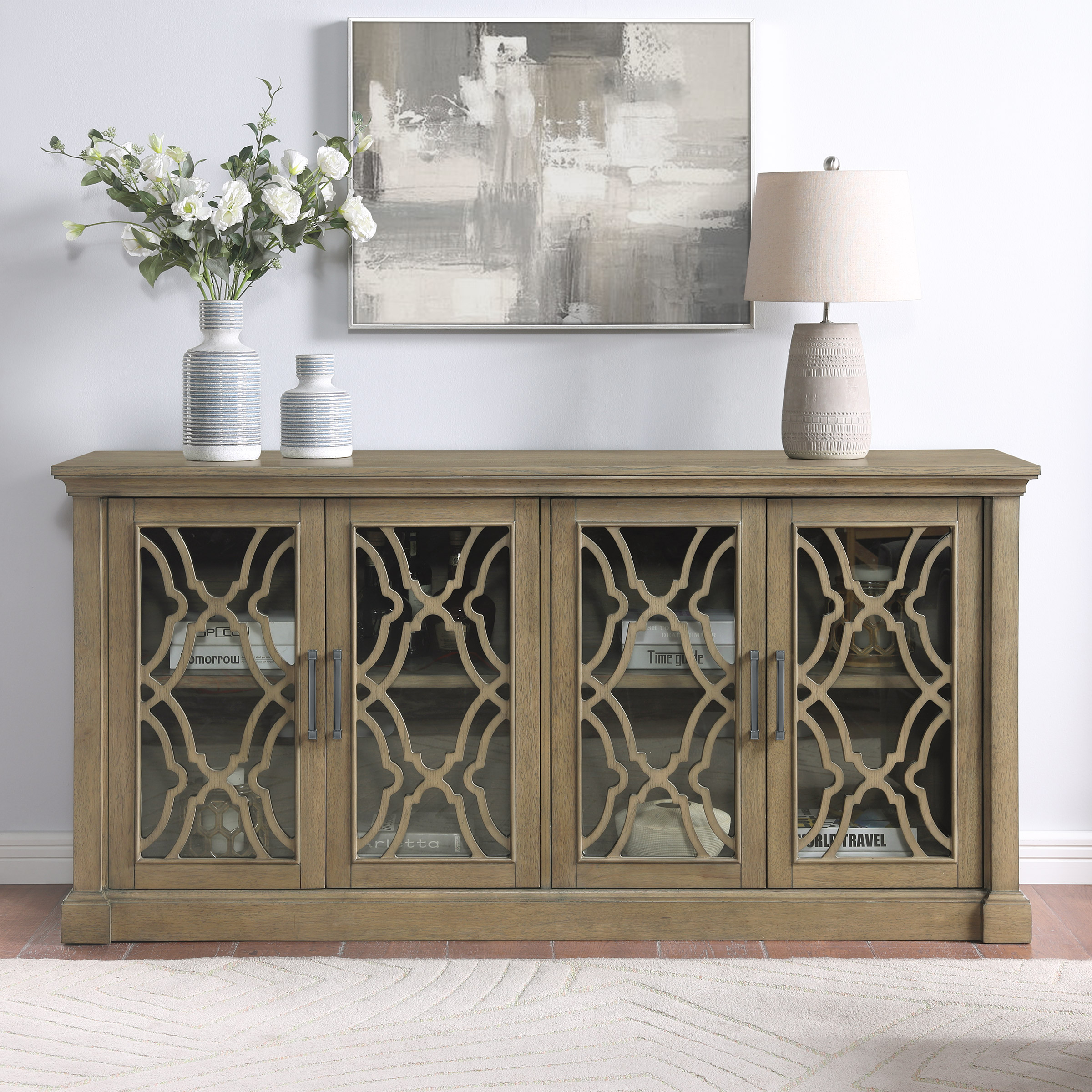 Make a statement in your home with the Huntington Multi Use Accent Console. Huntington is not only beautiful, but highly functional. Huntington is made of solid wood, oak veneer, and completed in a hand applied multi-step weathered wheat finish. Huntington is perfect as a media stand and for media storage as well as an elegant accent piece. Huntington features a decorative motif on its doors that truly make it stand out. You have incredible versatility with those doors as you have the option to use all wood, all glass, or a mixture of the two as the panels are easily interchangeable to change your look. Each door in on a slow close hinge and you have adjustable storage shelves for your storage needs. The back panel is ventilated and has cord management for ease of use with your electronics. Huntington is an heirloom that will be in your home for years to come.