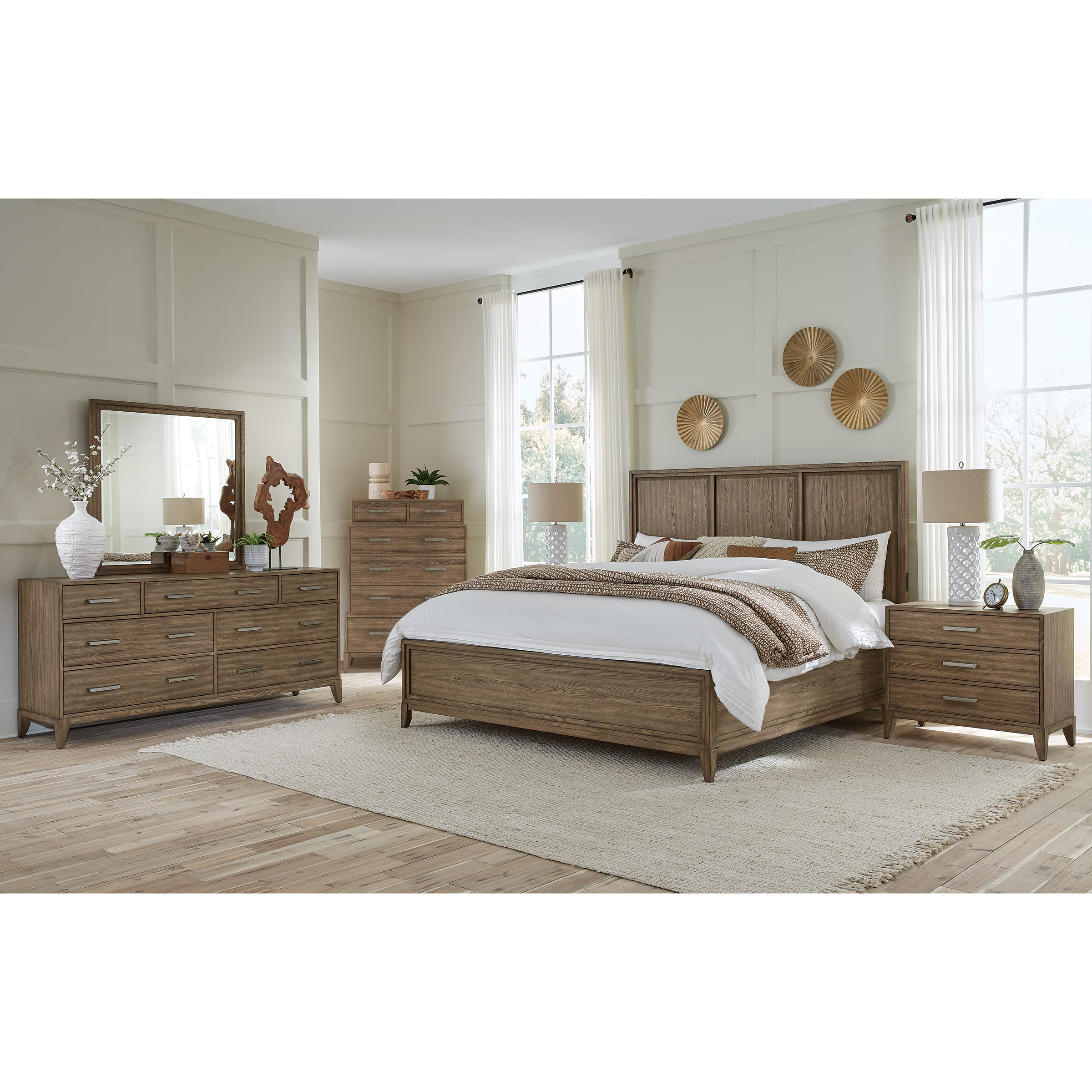 • (1) Queen Bed, (2) Nightstands, (1) Drawer Chest, (1) Dresser, and (1) Mirror
