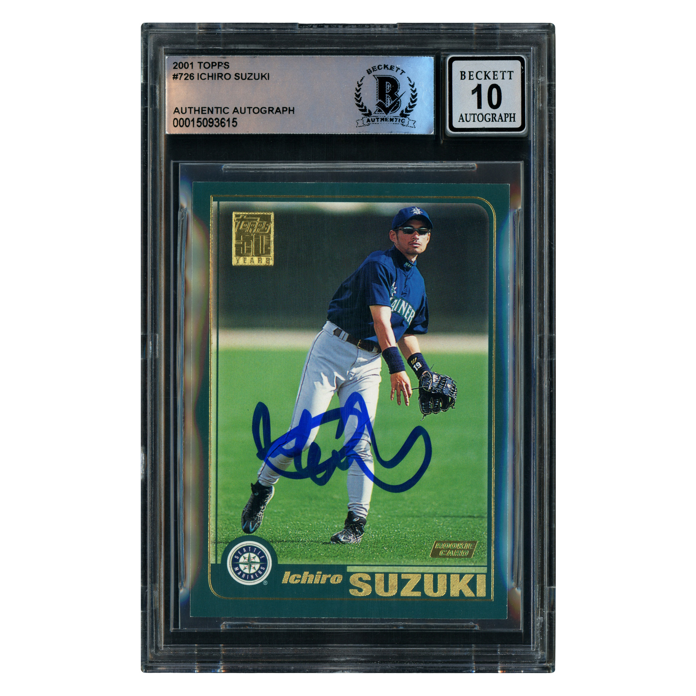 This is a 2001 Topps Rookie Card #726 that has been hand signed by Ichiro Suzuki. The condition of the signature was graded a Gem Mint 10 by Beckett BAS. It has been certified authentic by Beckett Authentication Services (BAS) and comes encapsulated in their tamper-proof holder. This item was signed at an official Ichiro Suzuki signing witnessed by Mill Creek Sports.