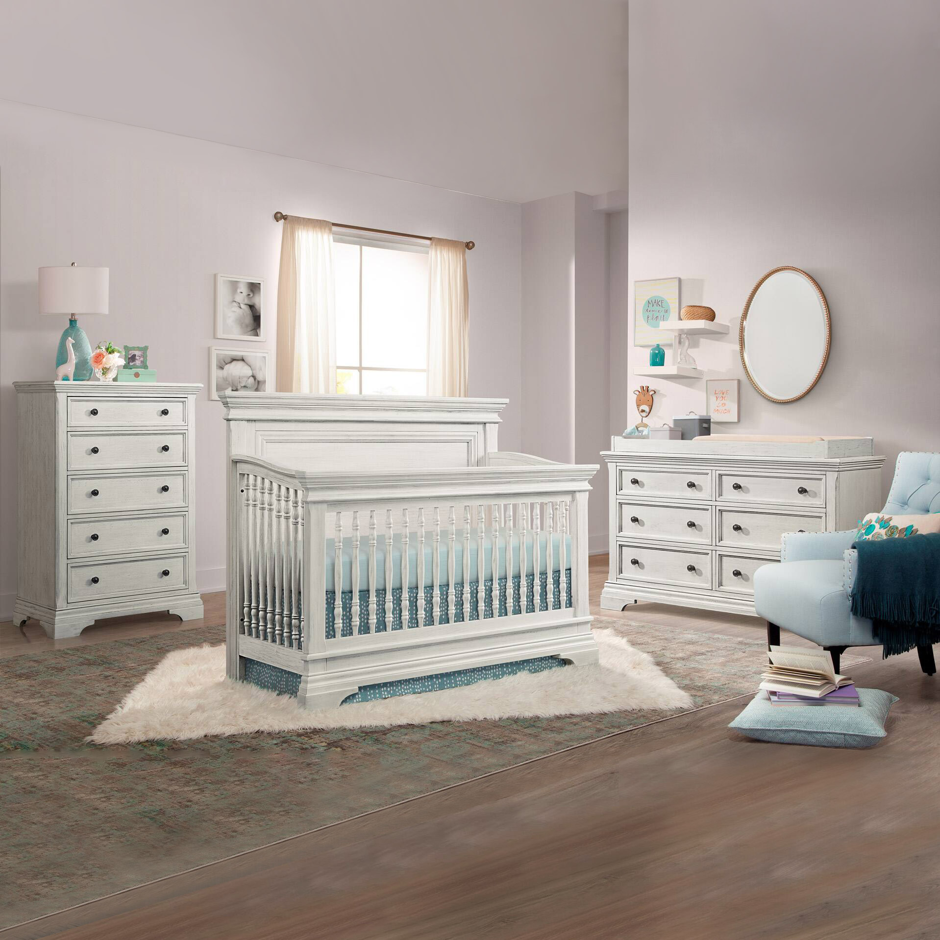 The Ashley Collection’s vintage styling creates an elegant yet playful look for your child’s room. The Crib features antique detailing on the headboard and footboard with detailed spindles. The Ashley convertible crib features steel spring mattress support with three positions that can be adjusted as baby grows. It can also be reconfigured into a toddler bed, daybed, and full-size bed as your child grows. All conversion rails are included and easy to assemble.The fully assembled 6-drawer dresser features solid wood frame construction and generously sized drawers to store all of your child’s clothing and accessories. The drawers are built with traditional English dovetail construction with soft-close drawer glides for ease of use.  The changing tray is added to the top of your dresser for a safe and comfortable changing station. The 5-drawer tall chest features solid wood frame construction is built with traditional English dovetail construction and soft-close drawer glides.3-Piece Set Includes: Convertible Crib with Conversion Rails;  fully assembled 5-Drawer Chest; fully assembled 6-Drawer Dresser with Changing TrayConvertible Crib: