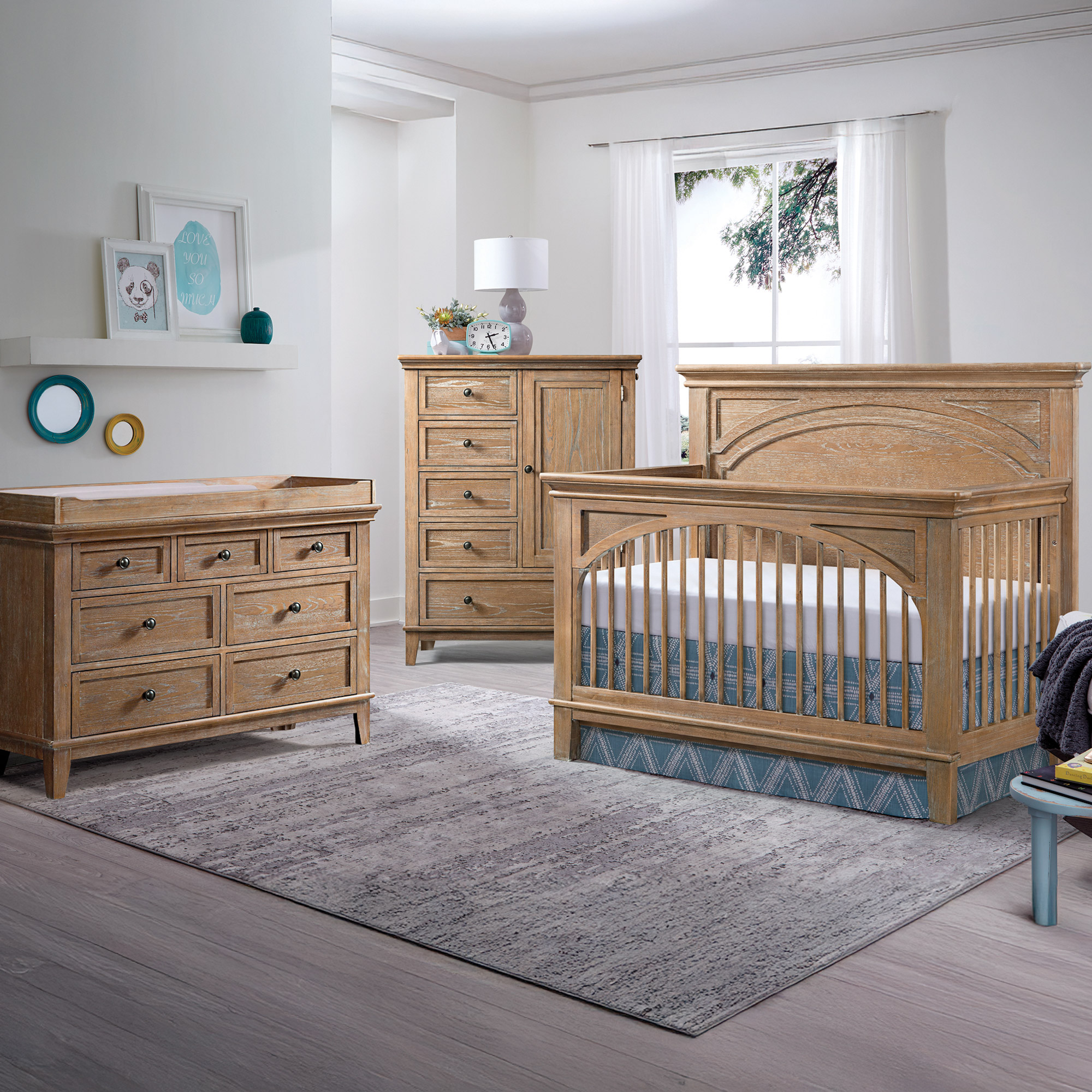 The weathered sandwash finish, simple spindles and intricate moldings create a beautiful look that will charm your baby's room at all ages in the Lisbon Collection. The Lisbon 4-in-1 convertible crib features steel spring mattress support with three positions that can be adjusted as baby grows. It can also be reconfigured into a toddler bed, daybed, and full size bed as your child grows. All conversion rails are included and easy to assemble. The fully assembled 7-drawer dresser and 5-Drawer, and 2-shelf Chifferobe features solid wood frame construction and generous sized drawers to store all of your child’s clothing and accessories. The drawers are built with traditional English dovetail construction with soft close drawer glides for ease of use. The changing tray is added to the top of your dresser for a safe and comfortable changing station.