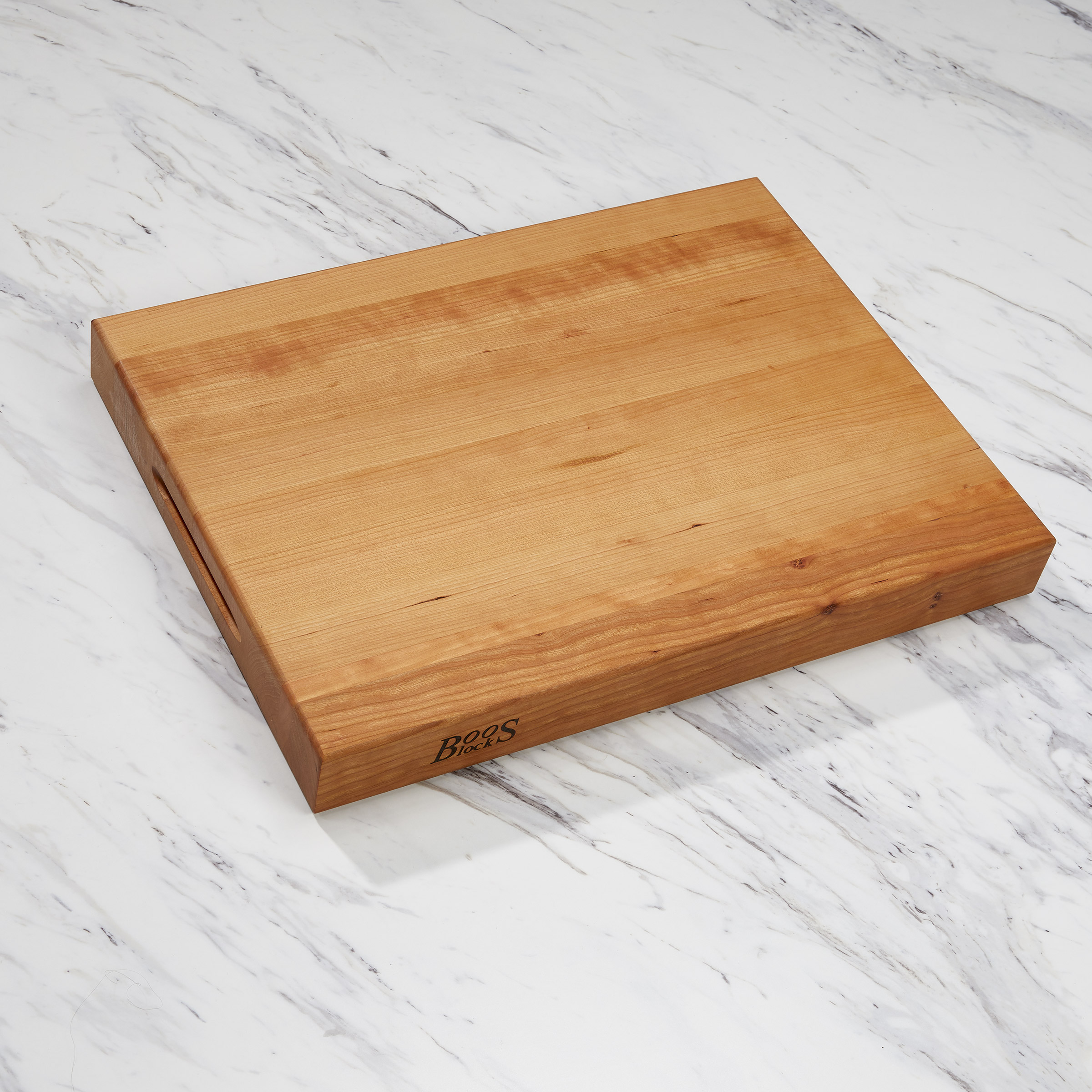 The John Boos classic cherry reversible cutting board never goes out of style. Hand grips on both ends of the board for easy carrying. The board is reversible. Hand wash.
