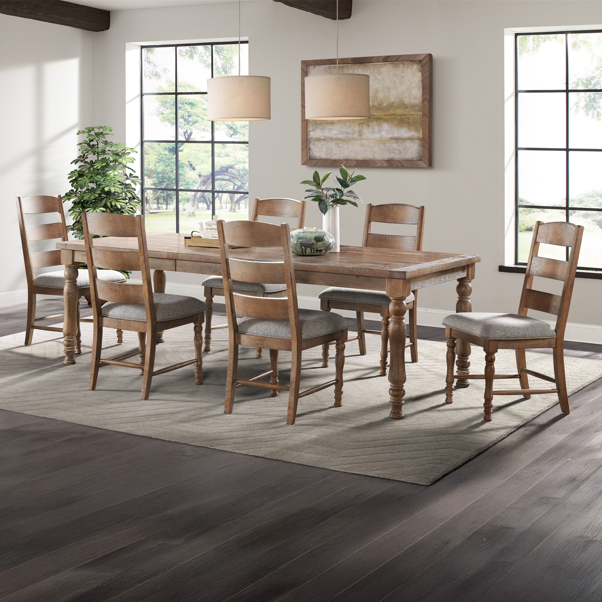 The Jordan Dining Collection has a rustic Farmhouse aesthetic. The classic designed chairs have a comfortable cushioned fabric padded seat and turned legs. This dining table extends up to 94” with the self-storing leaf. The tabletop has a rough sawn top giving each piece a casual appearance and includes classic turned legs.