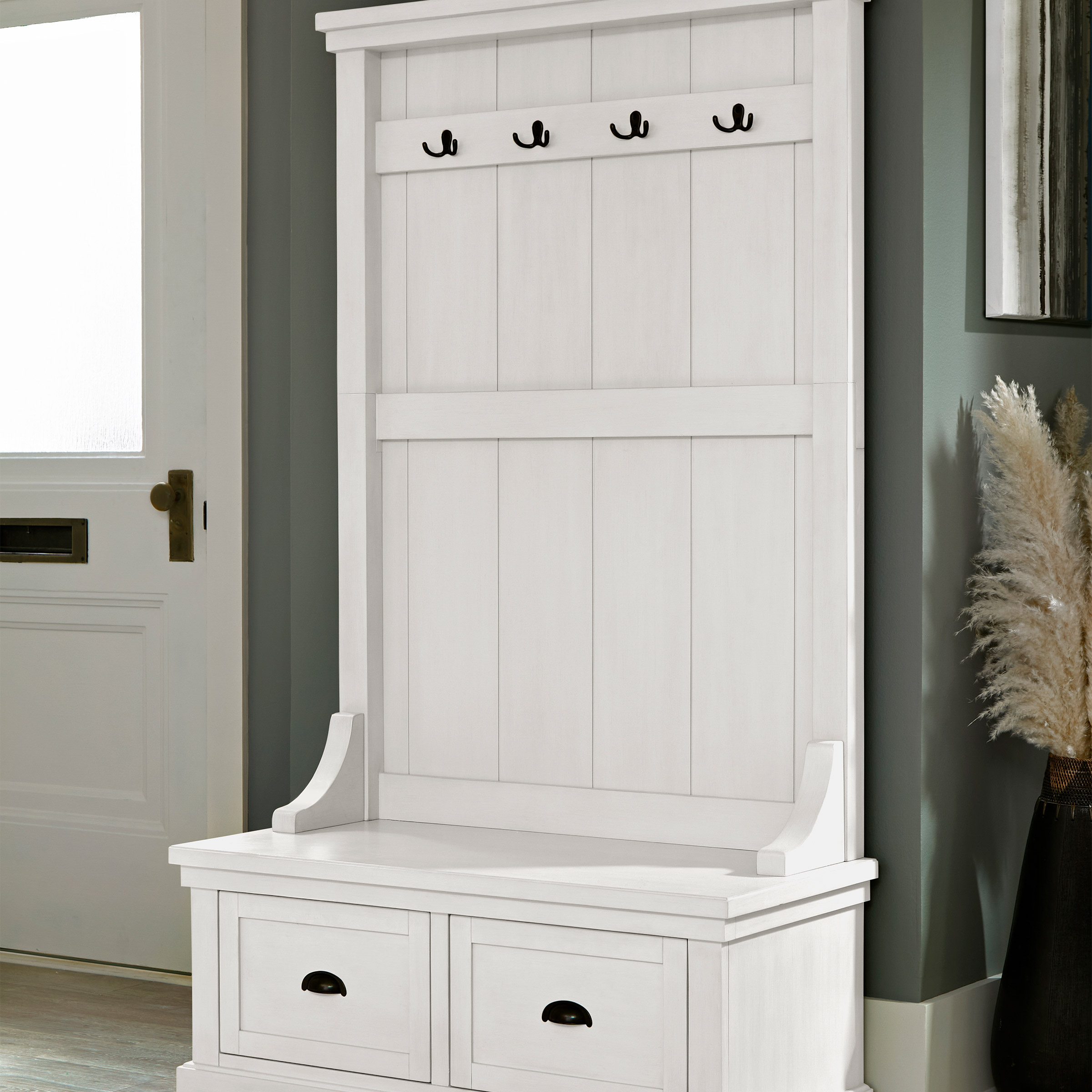 Create ultimate organization for your entryway or mudroom with the Kennedy hall tree. This versatile piece is as beautiful as it is functional. With a white or light grey finish complemented with dark oil-rubbed bronze hardware, and a classic paneled back with distinctive moulding, this must-have organizer is the perfect complement to any style or decor. Features four sturdy double hooks for hanging coats, dog leashes, bags and more, as well as two large drawers for additional storage and a convenient built-in bench.