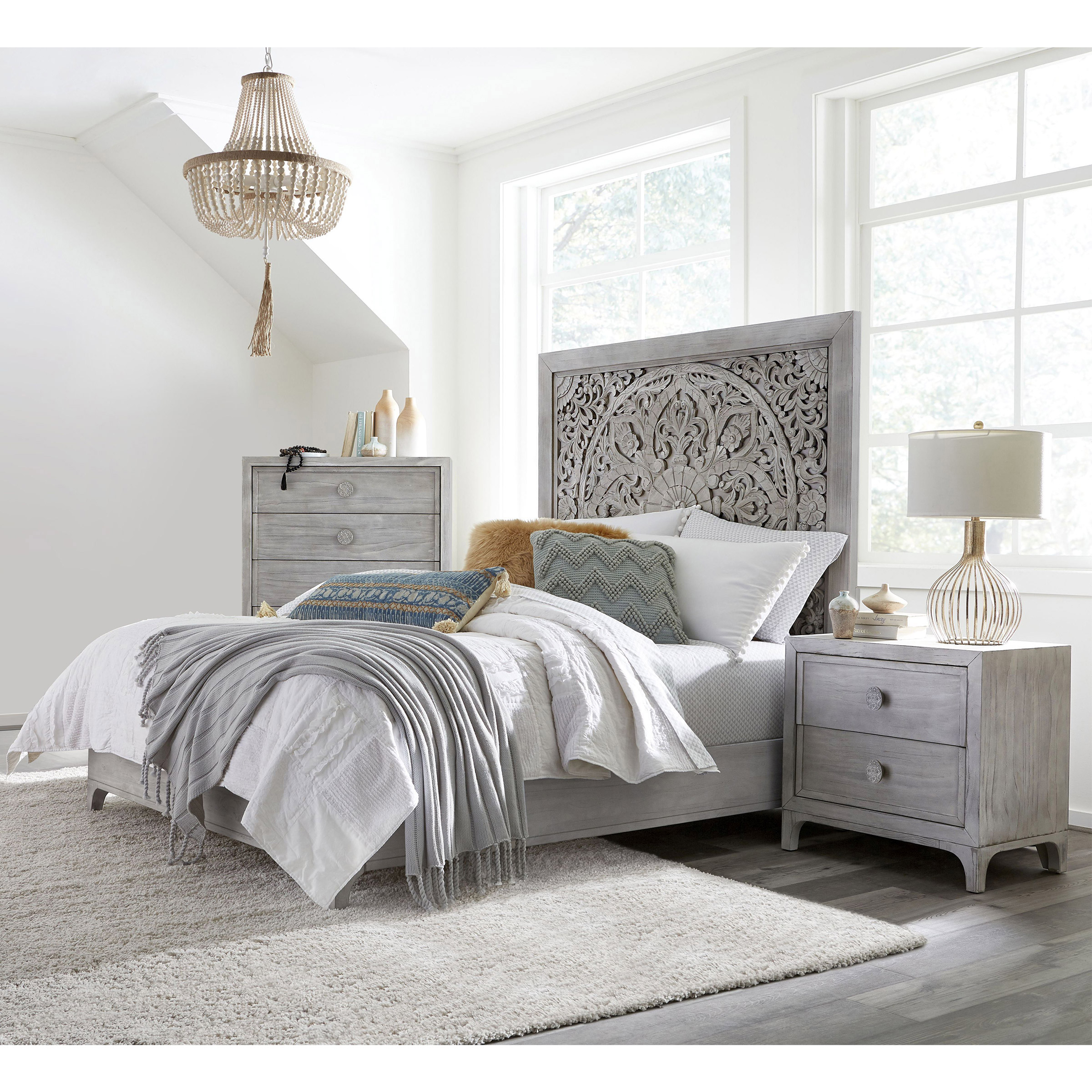 Add a Bohemian style to your bedroom with the globally inspired Kinzly collection. The high headboard is intricately carved with a mandala pattern, a spiritual symbol that is said to establish a sacred space. The carved elements are polyester-formed in molds created from original wooden hand carvings. Crisp edges, delicately curved feet and sculpted drawer pulls pair with mitered top and side panels for a clean look. Made from sandblasted Pine solids and veneers to create an organic raised grain texture, and a washed white finish uses a sand-through effect to showcase the wood’s natural texture and grain. The bed does not require the use of a box spring as the rolled slat system is designed for use with just a mattress.