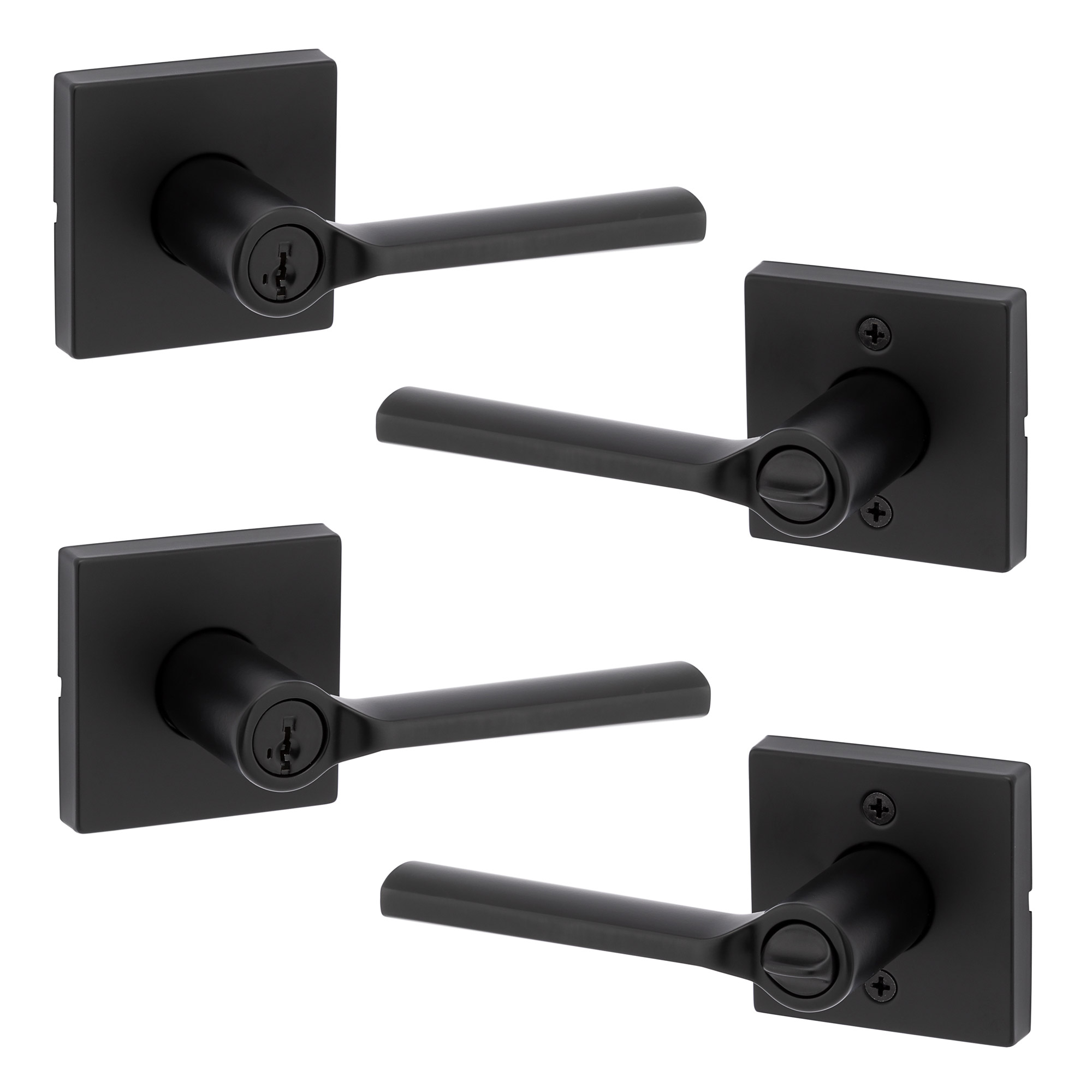 Step up to designer styles and superior security with Kwikset Signature Series products. Lisbon is the quintessential example of contemporary design. The unique thumb rest is precision-crafted for ergonomic comfort and the sleek, tapered contour of the lever brings simple sophistication to any contemporary setting. Features: Keyed Entry with SmartKey Security™ Levers: The Keyed-Entry is best used on exterior doors where keyed entry and security is needed. Both levers/knobs can be operated by a key on the outside or thumb turn on the inside. Featuring SmartKey Security™, which protects against advanced break-in techniques and allows you to re-key your lock yourself in seconds. SmartKey Security™ re-key technology is compatible with Kwikset (KW1) keyway or (SC1) keyway options. Latch has adjustable backset 2-3/8" to 2-3/4" to fit all standard door preparations. Includes full lip round strike. Locking mechanism functions with turn piece on the interior of the lock. Includes: 2 - Kwikset Keyed-Entry Lever Sets (4 levers total) - Matte Black or Satin Nickel Specifications: