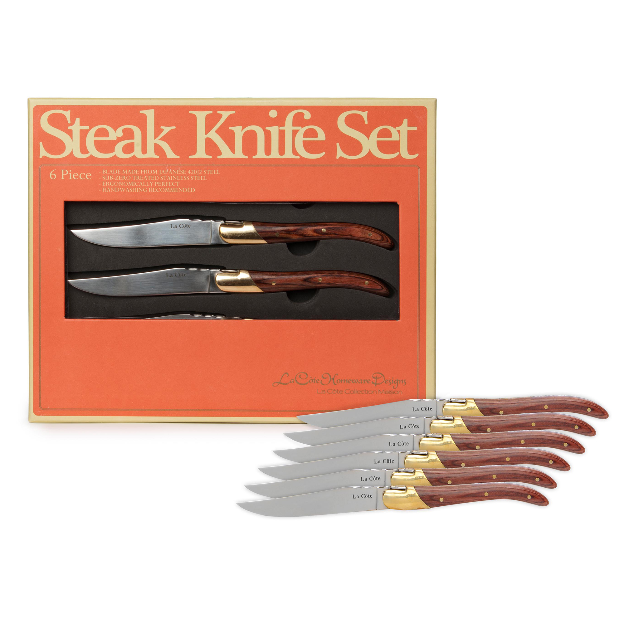 These beautifully designed, precision-crafted steak knives feature razor-sharp, polished stainless steelblades and Pakka wood handles. You will discover that each handcrafted Pakka wood handle is unique, with differences in grain and colouring, offering individual characteristics as each handle has responded differently to the finishing process. Each handle also features the traditional Bee emblem and is elegantly finished with brushed copper bolsters.6-piece Set Includes: