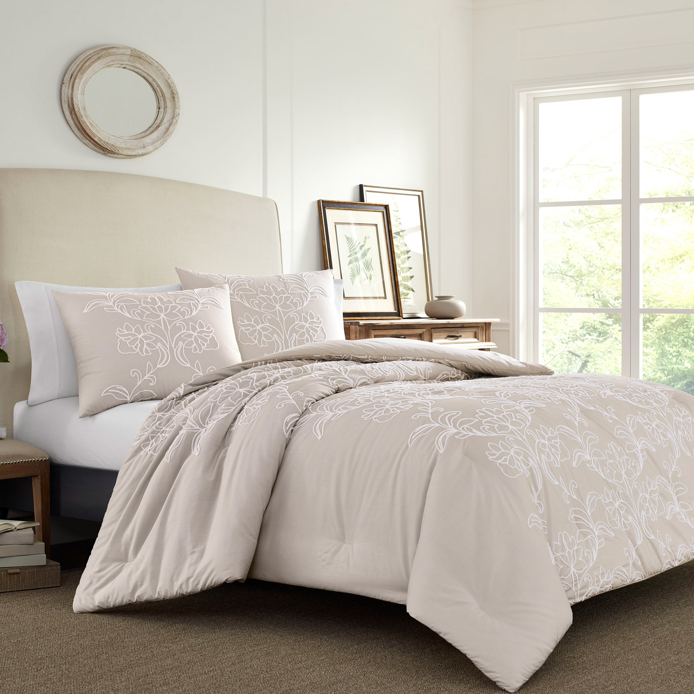 Add natural warmth to your bedroom decor with this sophisticated embellished comforter set in neutral tones of linen and white. Chenille embroidery creates a dimensional floral vine panel that runs up the center of the bed and decorates the standard shams as well.Construction: