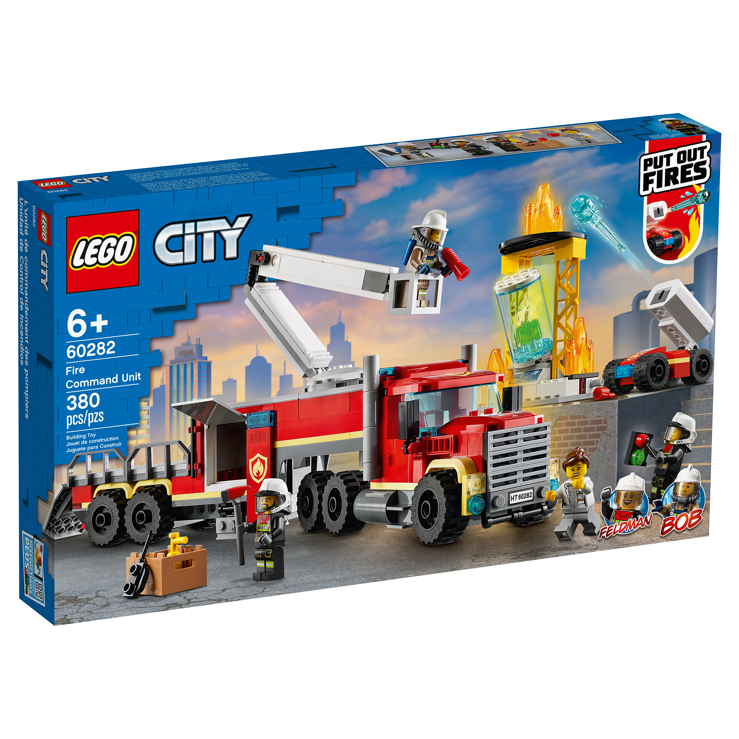 This exciting LEGO® City Fire Command Unit playset includes a classic fire truck with a functioning cherry picker arm. Kids also get a host of LEGO City TV characters, including Bob, Feldman and Toastie the firefighter robot complete with a water cannon that shoots water elements. The fire truck has a compartment for storing the firefighting accessories, plus a trailer with a ramp for transporting Toastie the firefighter robot. Includes 3 firefighter minifigures with helmets. LEGO City fire playsets deliver a world of fun where creativity can thrive, with feature-rich buildings, realistic vehicles and exciting characters that inspire imaginative play based on real-life scenarios.