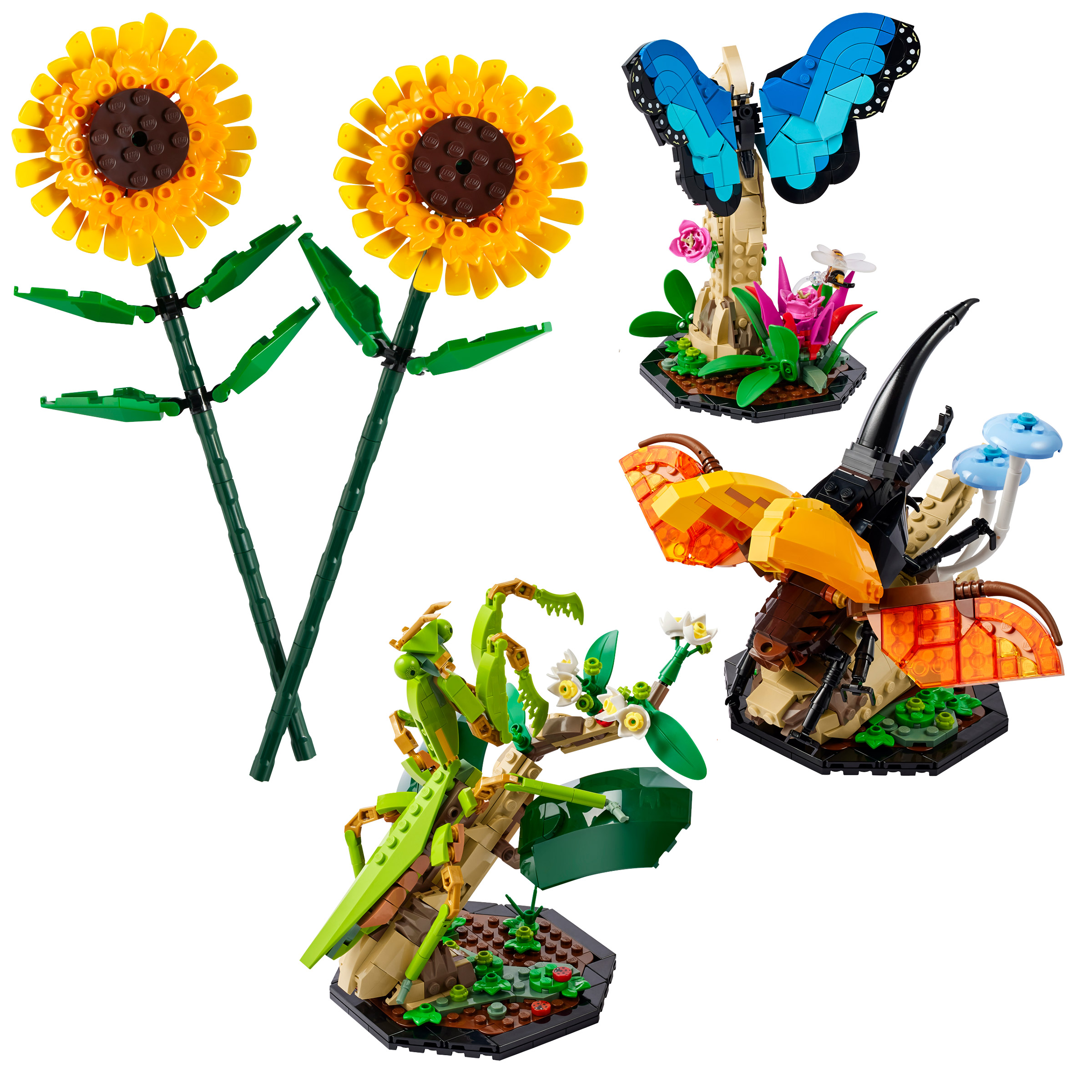 The blue morpho butterfly has adjustable wings featuring LEGO elements in different shades of blue and is displayed with a buildable flower and a honeybee. The Hercules beetle has attachable wings and the characteristic horns of the male of the species, while the fully posable female Chinese mantis (a species of praying mantis) comes with a 7-spotted ladybug. Separate building instructions are included for each model, so you can build solo or with others.