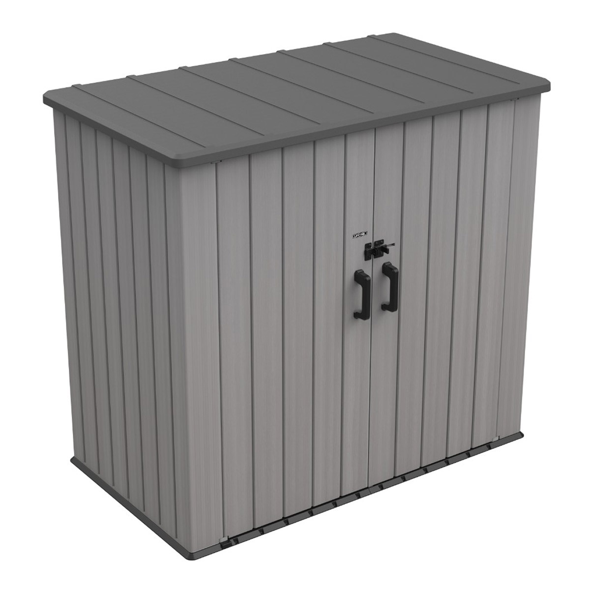 WARNING: This product can expose you to Nickel, which is known to the State of California to cause cancer and birth defects or other reproductive harm. For more information go to: www.P65Warnings.ca.gov.Decluttering your garage and maintaining your yard can be a challenging job. Between all the tools for the upkeep of your yard and the different objects taking up valuable space in your garage, you need the right solution to keep everything organized. The Lifetime Utility Shed is a mid-sized storage solution for households in need of extra storage space. It is large enough for residential garbage containers, lawn mowers, and bikes, but also equipped with shelving and removable wall hooks for smaller items such as hand tools, power cords, shovels, and rakes. The double-hinged doors fully open making it convenient to move items in and out of the shed. The slider lock and deadbolts (lock not included) allow you to keep your belongings safe and secure. The wood grain texture and Rough Cut™ finish offers a stylish look and feel without the maintenance of wood. With the Lifetime Utility Shed, you can free up valuable space in your garage and keep outdoor equipment organized.