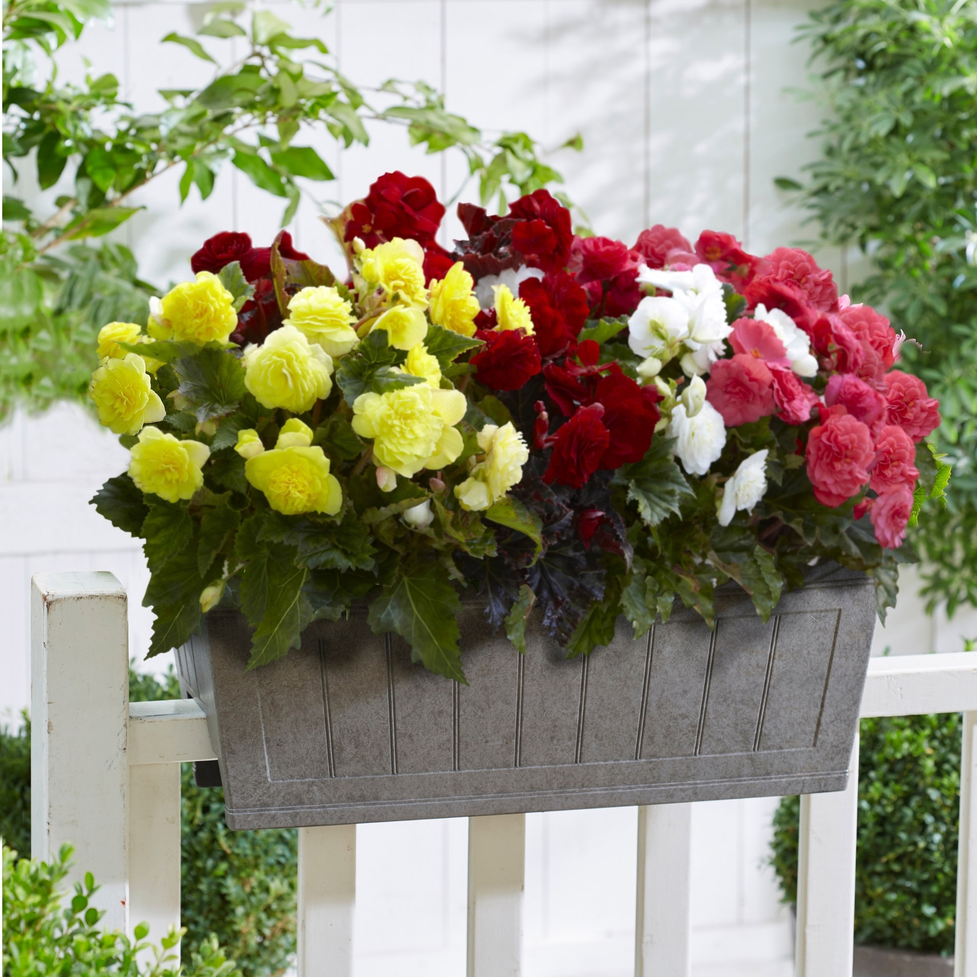 Recommended Arrival Week Based on StateWeek of February 21st:CA, AZ, FL, MS, LA, AR, TX , OK, GA, NVWeek of February 28th:WA, OR, KS, MO, NE, KY, TN, NM, NC, SC, ALWeek of March 14th:NJ, NY, PA, VA, DE, WV, MDWeek of March 28th:ID, UT, CO, CT, NH, VT, MA, RI, IN, IL, IA, MI, OHWeek of April 4:WY, MT, ME, MN, ND, SD, WIThis all-in-one-kit features everything you need to grow a gorgeous summer planter! The versatile 24” container can be used on patios, 4" or 6" deck rails, tabletops or as a window box. (Hardware not included for window box use.) The container is made of lightweight but durable plastic with an attractive faux gray stone finish. The kit also includes soil and 4 premium begonia tubers in a range of colors: red, yellow, white and pink. Non-Stop Begonias bloom summer to first frost and feature compact plants with beautiful double blooms. Place in a shady location to brighten up your garden!Begonia Container Garden includes: