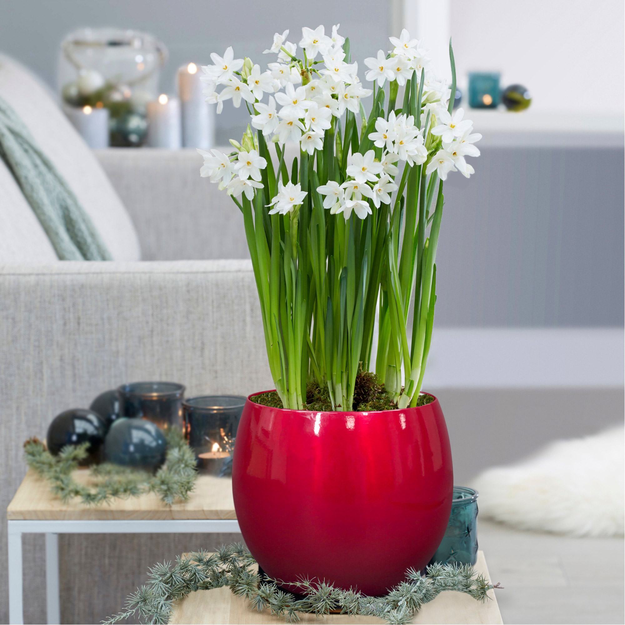 Paperwhite narcissus are easy to grow indoors. Plant the bulbs any time from late fall to early winter and watch the fragrant, snowy white flowers burst into bloom less than a month later. These all-in-one kits include everything needed for success. Your choice of a metallic red or silver pot. A wonderful hostess gift for the holidays and beyond.