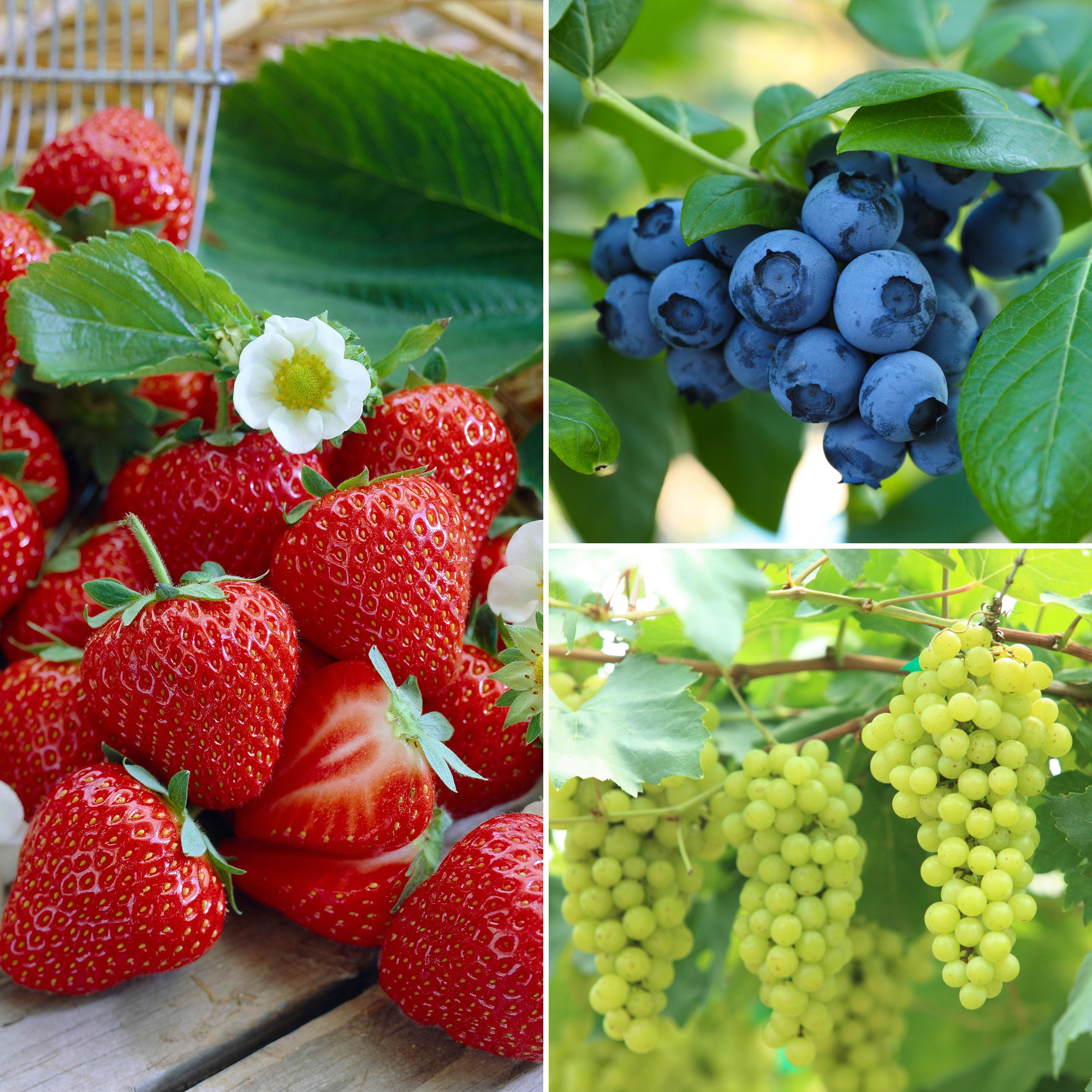 • Mature Height: Strawberry: 10”, Grape: 8-9ft, Blueberry: 4-5ft