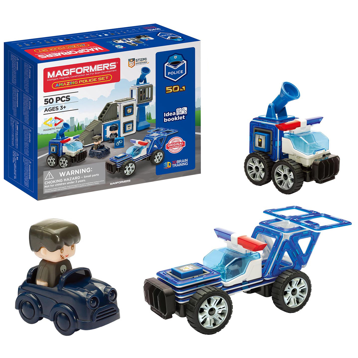 Click and create your own adventure with Magformers AMAZING Police 50 piece Set! Magformers are a magnetic construction toy where the possibilities are endless. Take off in a police car and race around town! Build a police lookout tower and zoom off in a police speedster. Each geometric shape contains magnets that never reject, so you’ll always hear the Magformers click. When playtime is over, use the magnetic power to simply stack and store the pieces.