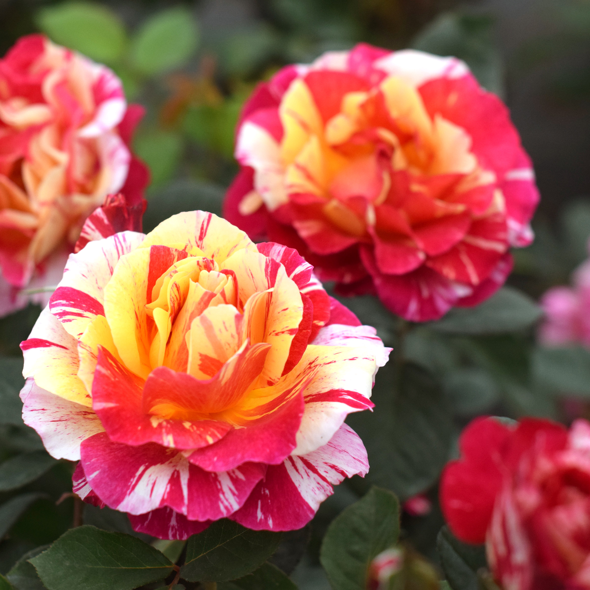 Maurice Utrillo™This stunning variety features striking large double flowers born in clusters of sharp reds, striped with broad strokes of yellow and white. A healthy bushy plant, it will create a color explosion when planted as a driveway boarder-hedge or single bush. The Maurice Utrillo Rose is extremely hardy and disease resistant. It is a prolific producer of flowers on a bush that grows to approximately 4 feet tall.