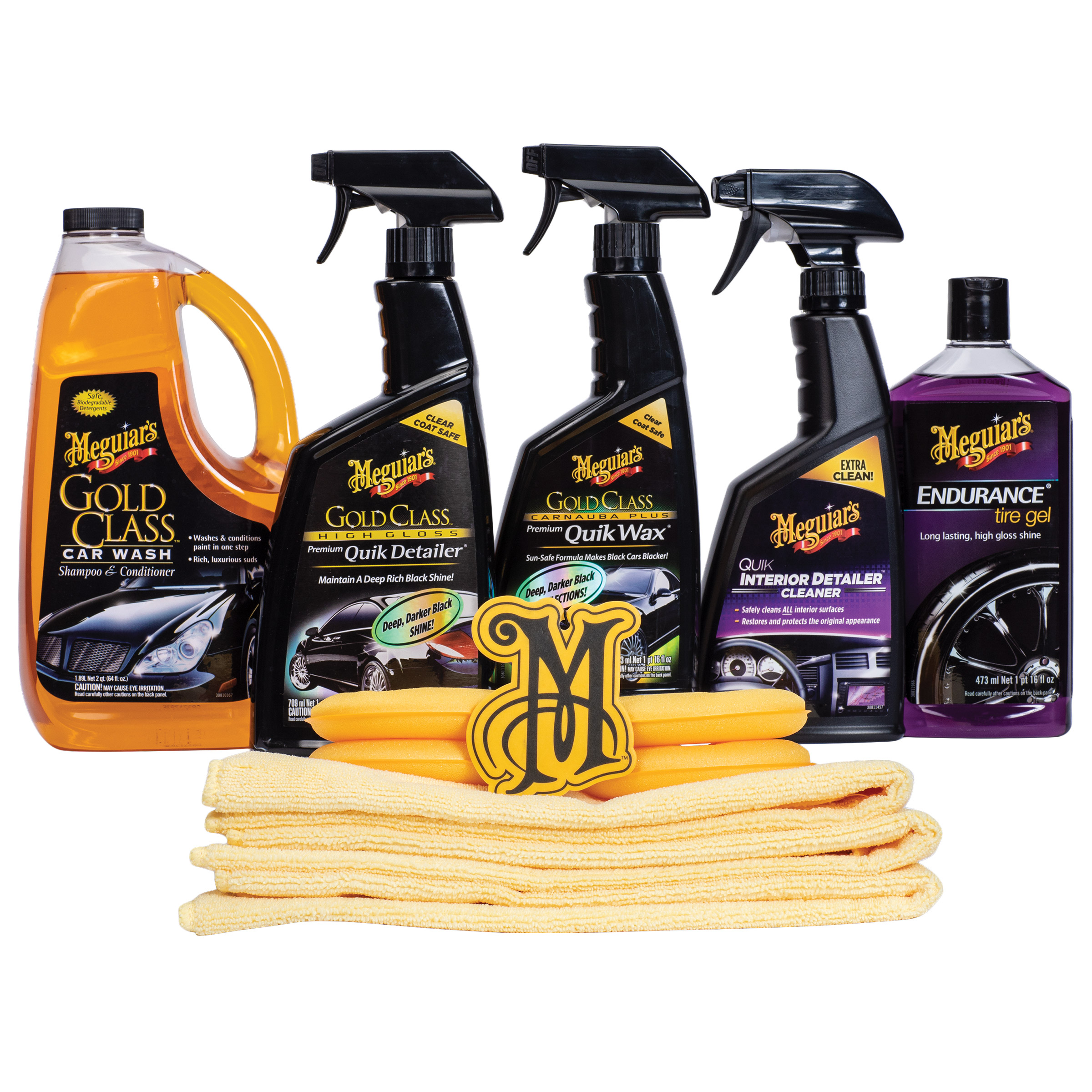 - 8-piece Kit: Wash, Spray Wax, Spray Detailer, Interior Cleaner, Tire Gel, Applicator Pads, Polishing Towels and Air Refresher
