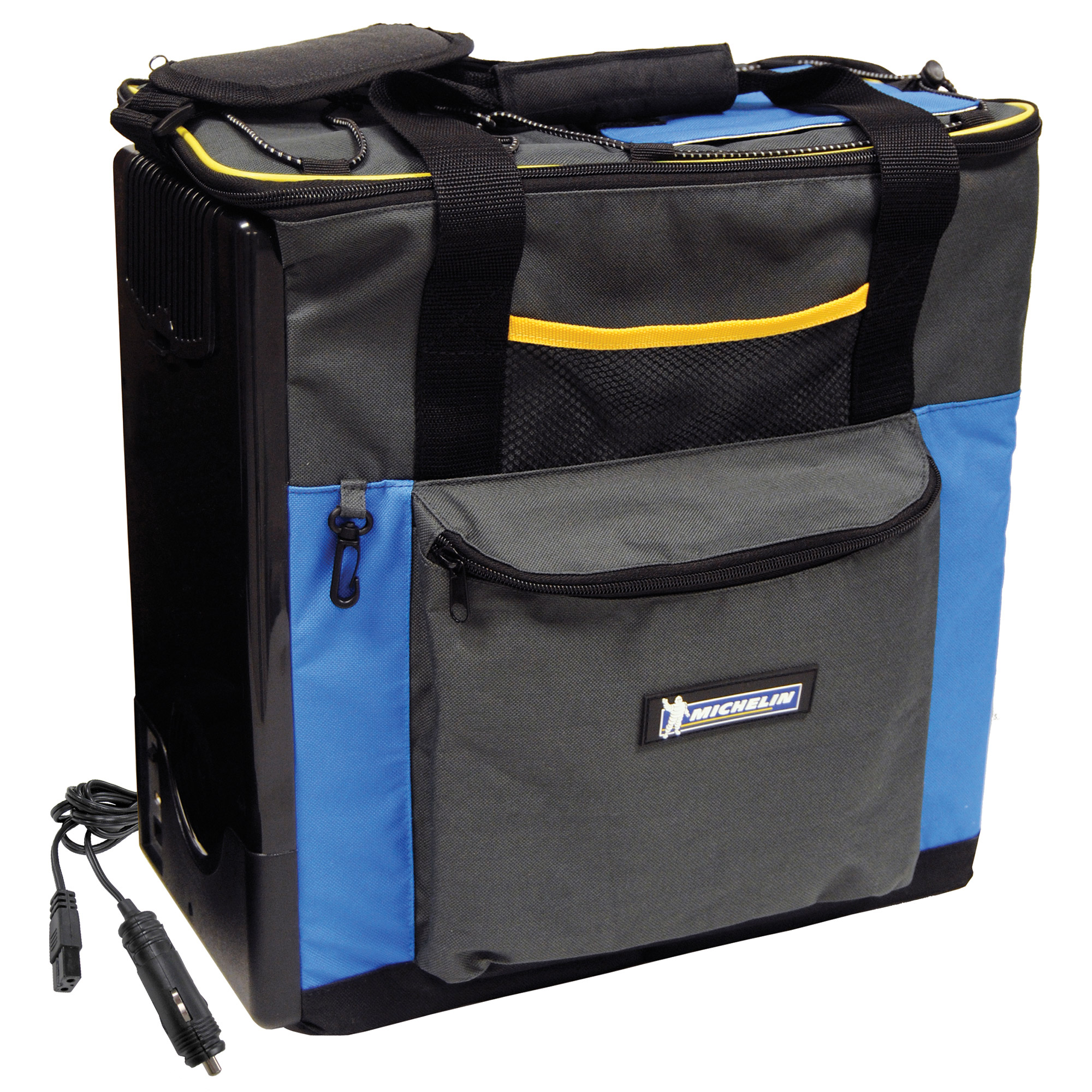 Warming and cooling in one portable package!The specially designed Michelin 12-Volt Hybrid Cooler features thermoelectric cooling and warming technology. Plug it into your vehicle’s 12-volt lighter to cool items to 40F below ambient temperature, or flip the plug to turn this cooler into a warmer. No matter where the road takes you, your Michelin Cooler will ensure a cold drink and snack are within arm's reach.The soft bag exterior features multiple pockets, built-in clips and bungee tie down to secure loose items, and a quick access lid. This versatile cooler weighs 11 pounds and has a 15 quart capacity, which holds up to 24 cans or up to three 2-liter pop bottles. No need to deal with costly and messy ice. The long-life brushless fan motor delivers even air circulation and the hard plastic injection molded interior ensures peak performance in any situation.The Michelin Soft-Sided 12 Volt Cooler is built to last and is the perfect companion for road trips, RVing, tailgating, camping, or boating. Take it from your vehicle to the campsite or sports event. Our design features adjustable shoulder straps and side handles for easy carrying.Features: