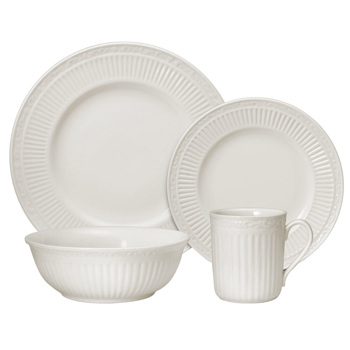 Adorn your table with the beauty of classic European architecture when you serve guests on this beautiful dinnerware by Mikasa. These stylish pieces are made from durable porcelain and feature column-like detailing with a warm white base. This 16-Piece Porcelain Dinnerware Set, service for 4, includes 4 each: dinner plate, salad plate, all-purpose bowl, and mug. Microwave and dishwasher safe.
