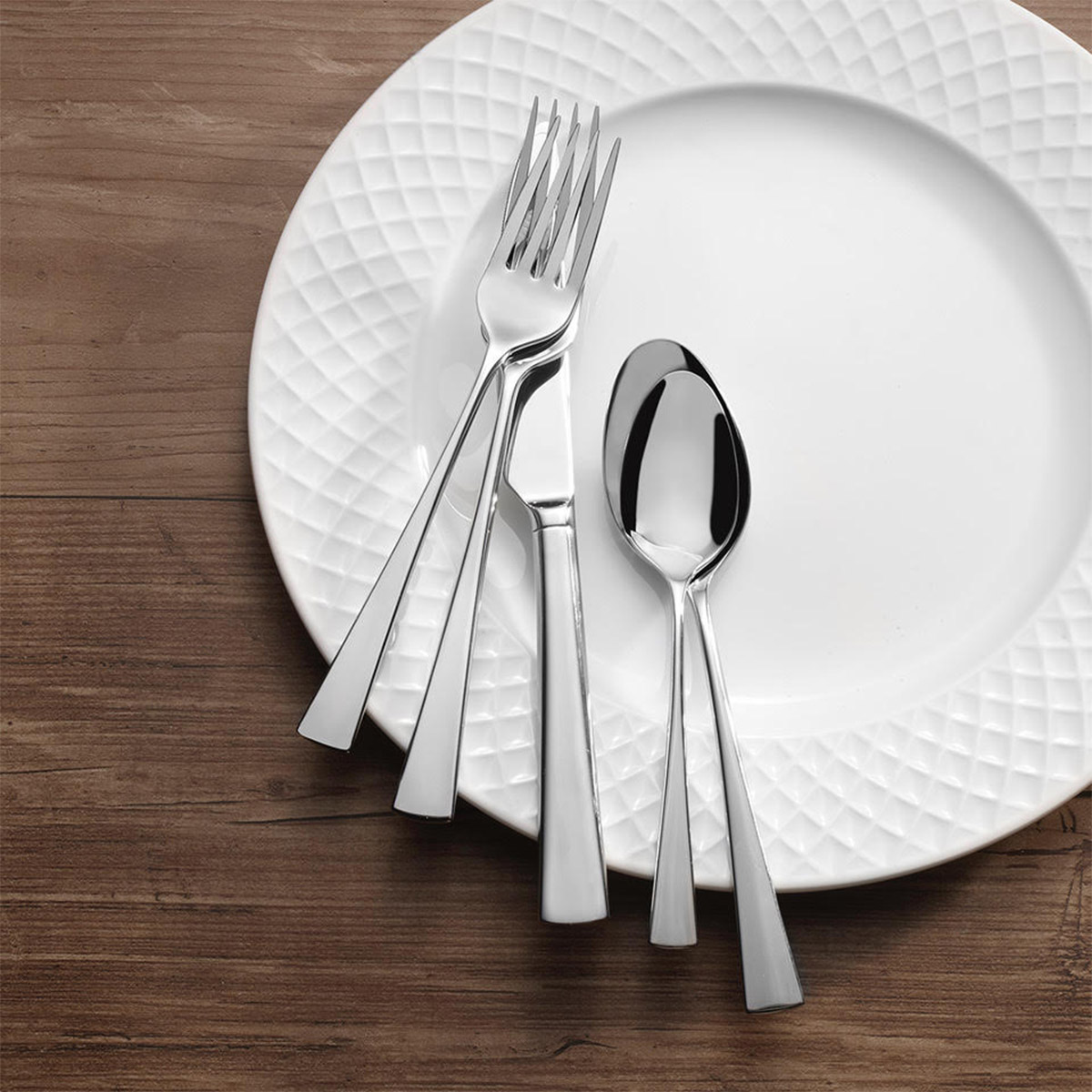 This Lucia 65-piece flatware set by Mikasa brings contemporary elegance to the table. Beautifully crafted of 18/10 stainless steel, this collection features a sleek design. Clean lines and angles define the understated handles, and a smooth polished finish adds a gentle shine to your tabletop display. 65-piece set, service for 12, includes 12 each of: dinner fork, dinner spoon, dinner knife, salad fork, and teaspoon, plus 1 sugar spoon, 1 butter knife, 1 serving tablespoon, 1 pierced tablespoon, and 1 cold meat fork. Dishwasher safe.