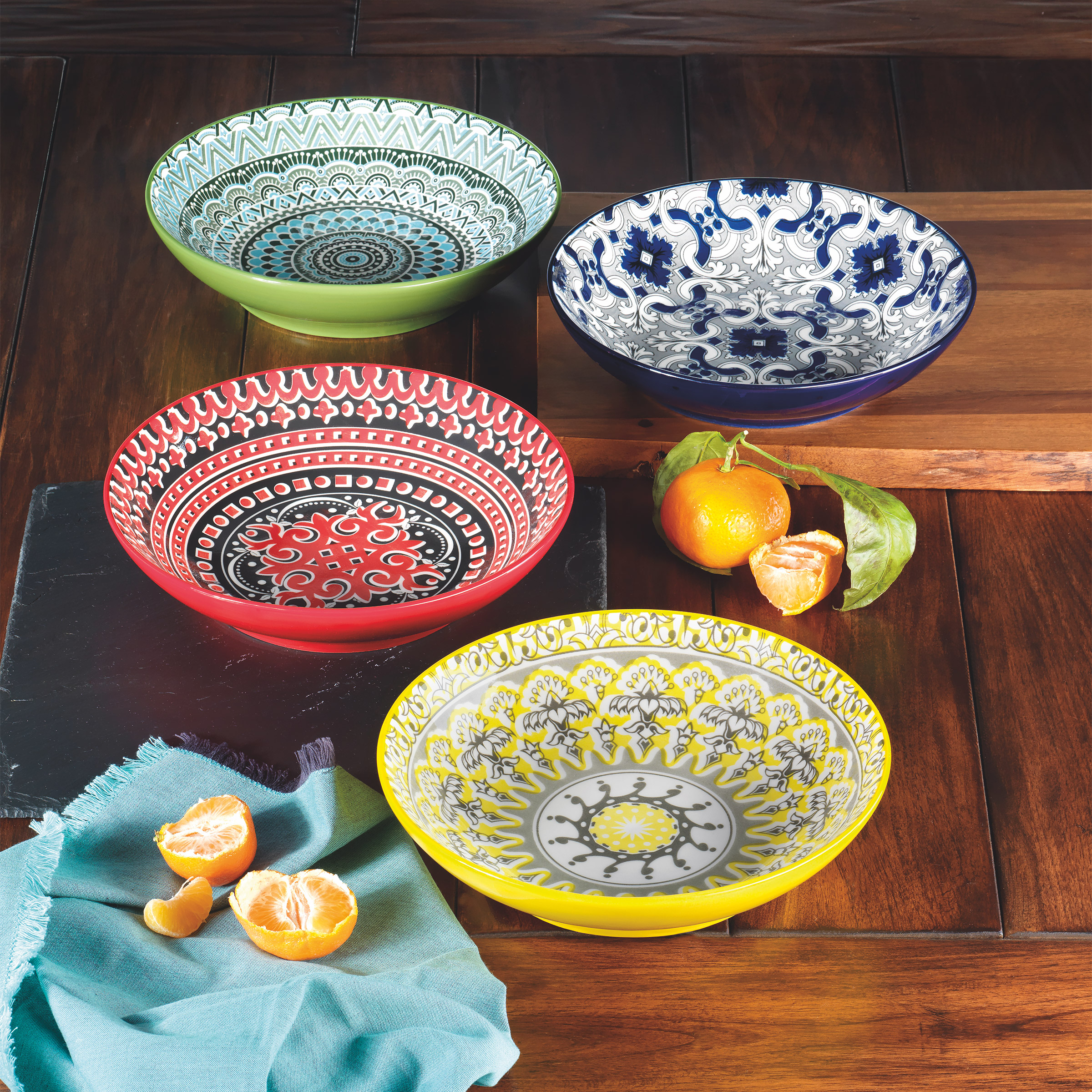 • Bright, colorful bowls inspired by Moroccan style