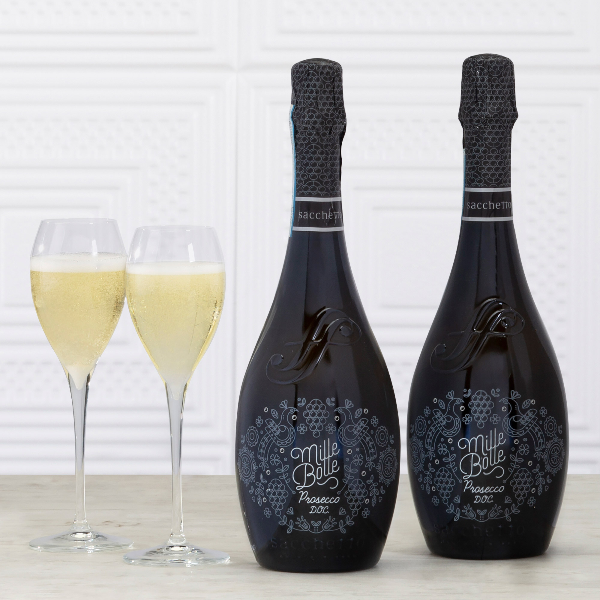 Celebrate anniversaries, birthdays, promotions, or just because with the Mille Bolle Prosecco Gift Set. This extra dry white sparkling prosecco comes from the Veneto wine region of Italy. Fragrant and fresh fruity aromas of pears and green apples with restrained acidity create a delightful taste that is light and crisp. Complete with two prosecco glasses, just chill, serve and enjoy!