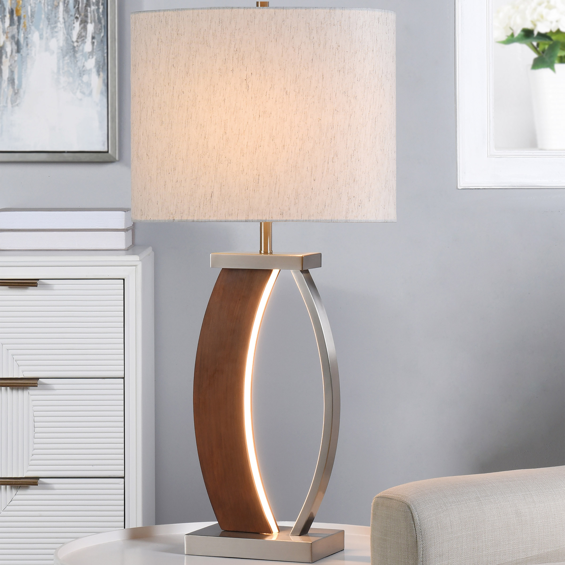 Beautiful polished wood in a warm, walnut finish is combined with brushed steel accents and base in this unique and multi-functional, 32.25” - tall table lamp with an integrated 6W LED night light. A regular 100W bulb shines brightly under a custom designed oval hardback fabric shade. The 6W LED nightlight glows from inside the arc wood piece. A 4 way switch controls every lighting option offering you the exact illumination needed with a distinguishing décor style.