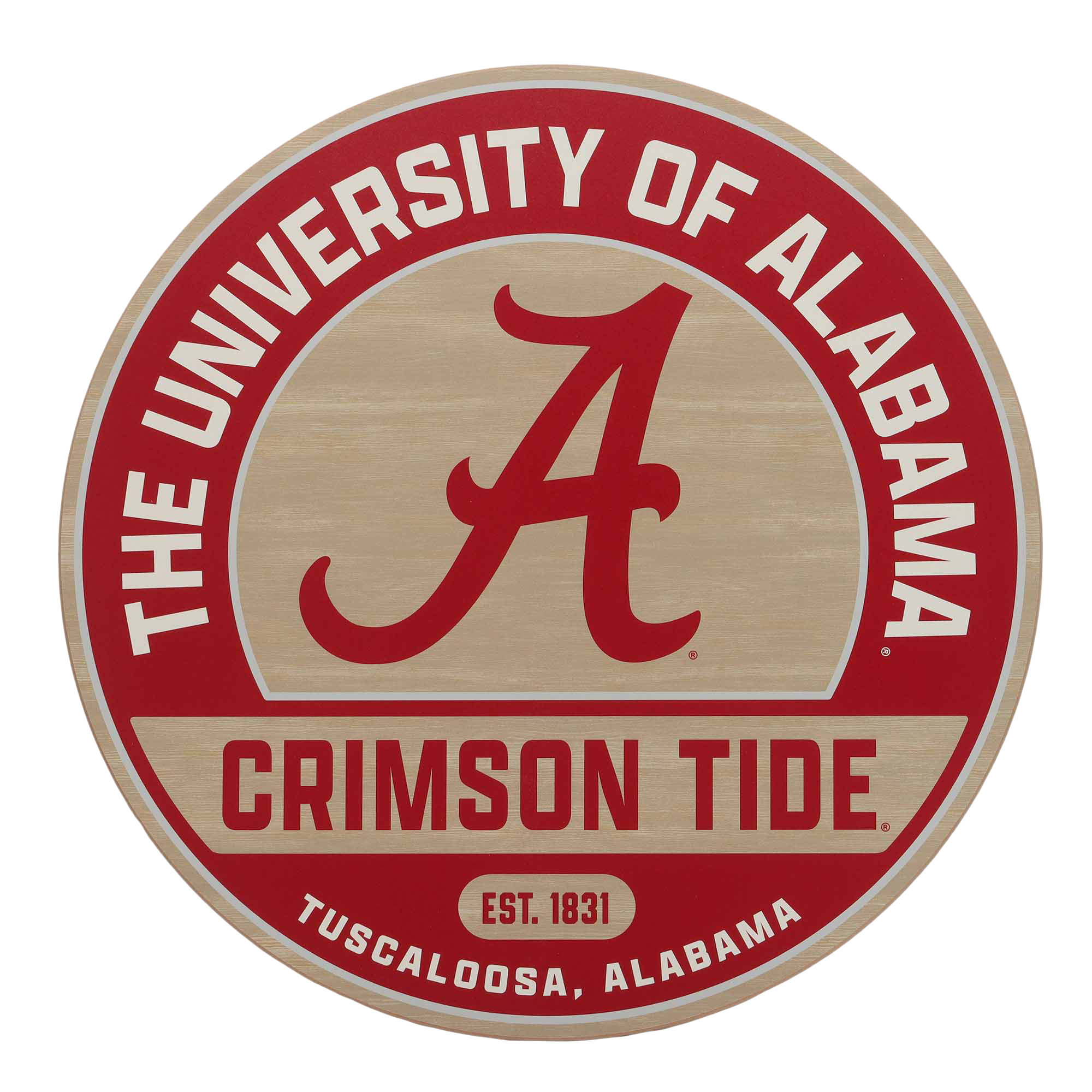 Wall decor featuring a vintage looking NCAA wood round sign; this is a must-have for any true fan of their favorite college! This item features a rich wood grain background that brings a rustic charm to your space while proudly showcasing the college of choice with their respective iconic color schemes.