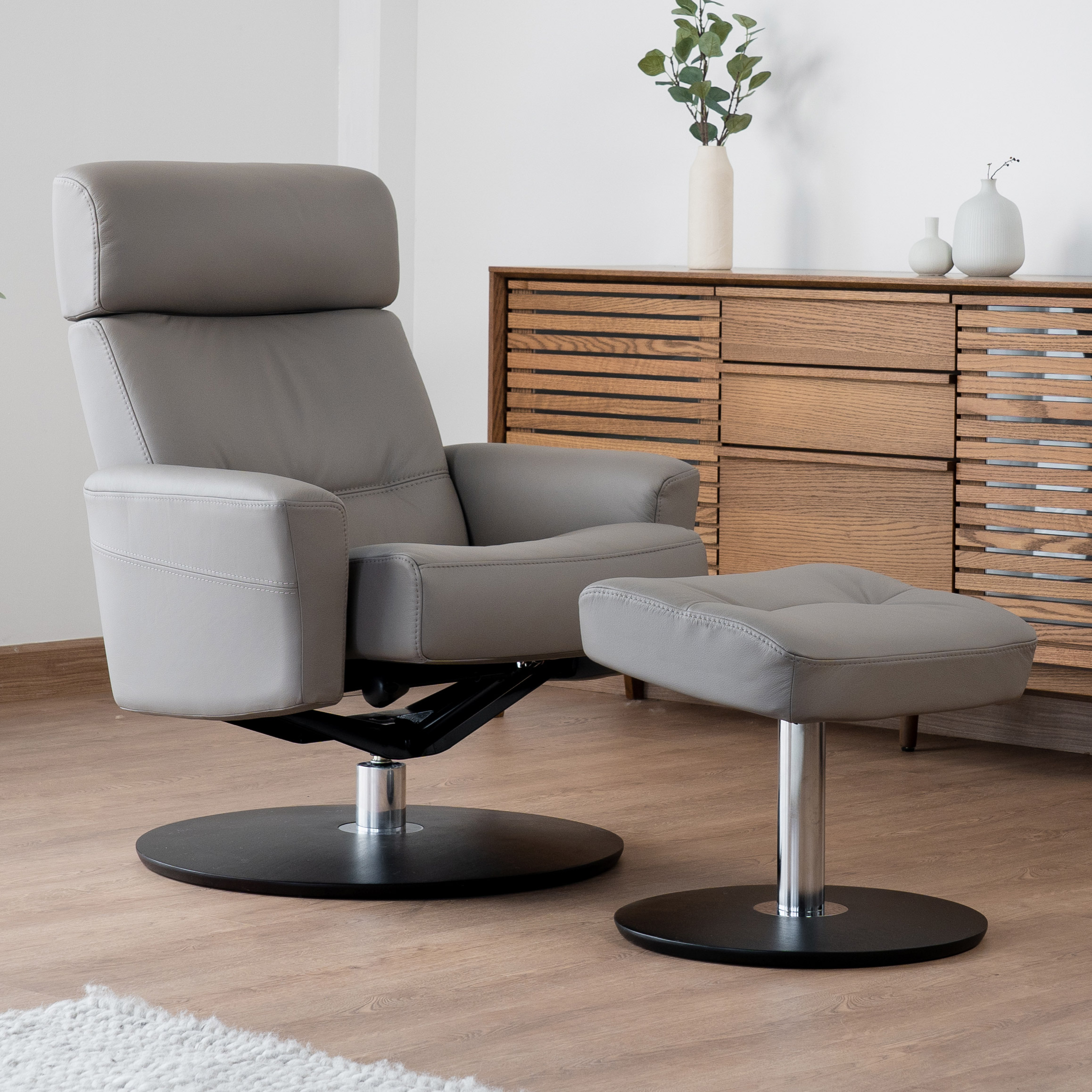 Product Label The Neo recliner and ottoman by Nordic Home® offers unsurpassed comfort through personalized recline, 360 swivel, a matching leather ottoman in a stylish Scandinavian design. The unique style with a soft padded arm, supple top grain leather and hardwood and steel frame, ensures unquestionable stability and long-lasting quality. Cold-cured molded foam offers unparalleled comfort and proper ergonomic support.