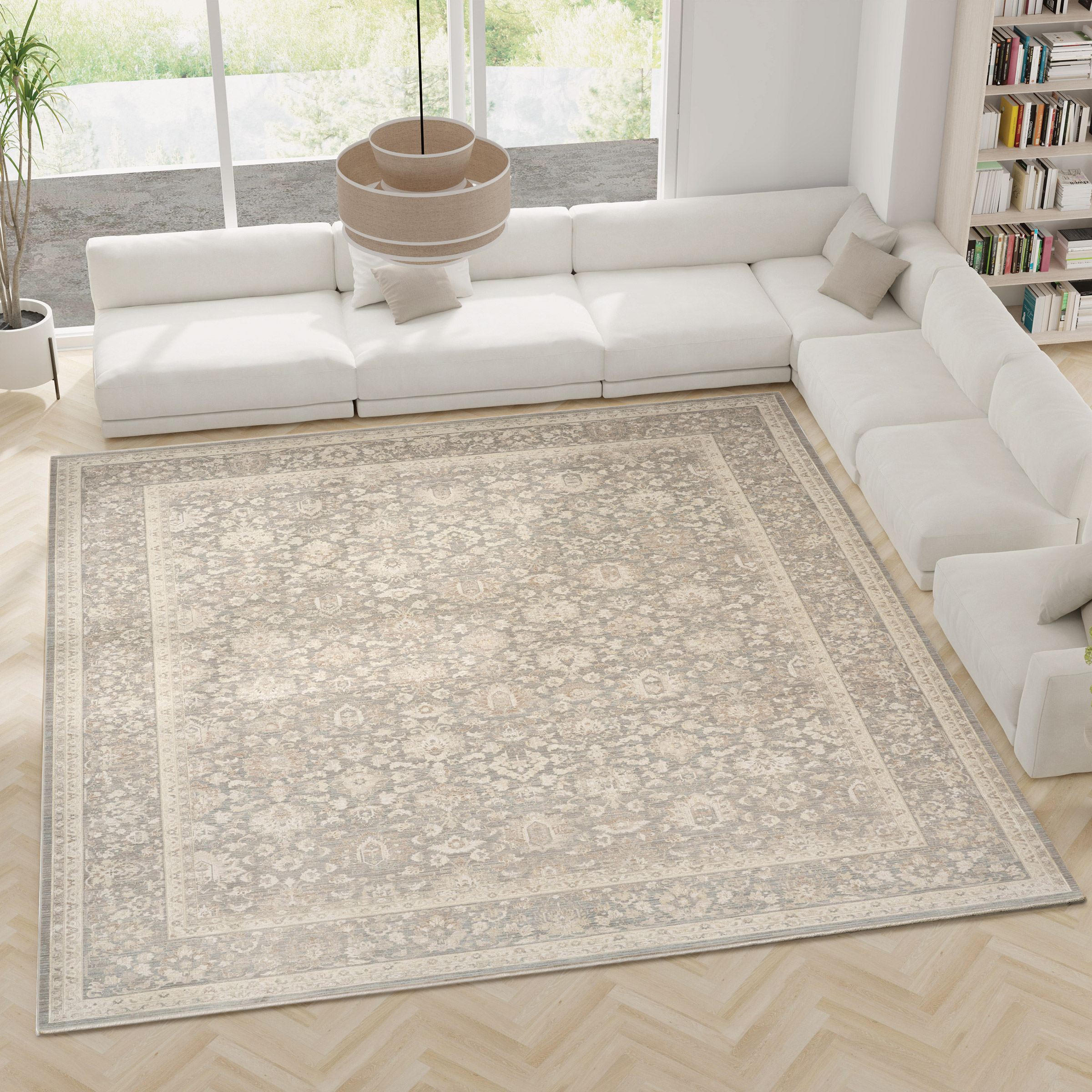This vintage-inspired rug from the Seraphine collection brings a graceful look to your space. The ornate floral pattern, presented in neutral grey, complements contemporary and traditional styles alike. Woven with a soft blend of polyester and viscose. Features: