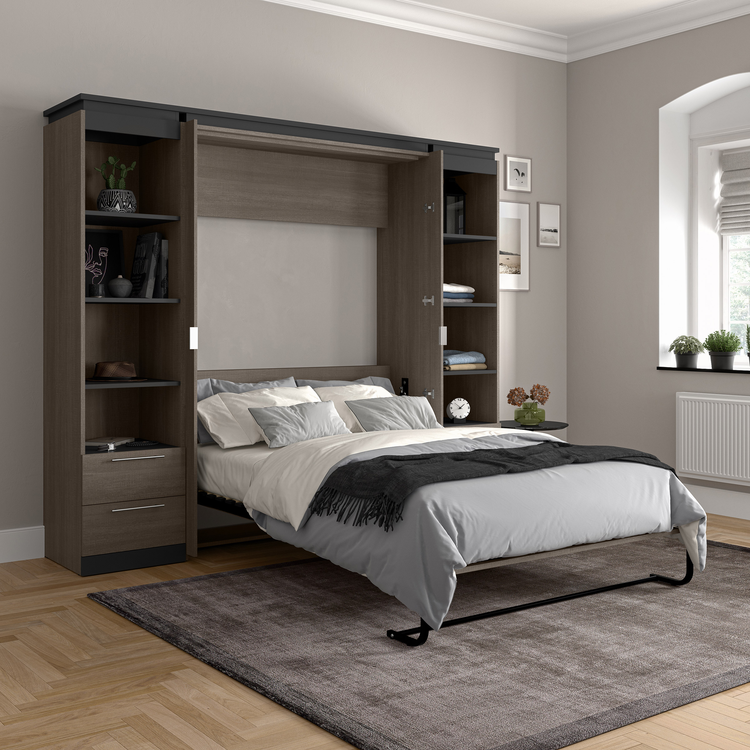 The Bestar Orion Full Wall Bed and 2 Narrow Shelving Units with Drawers is the perfect space-saving solution for modern homes. This cleverly designed bed allows you to make the most of your space by folding your bed away when it is not in use. With two narrow yet practical shelving units featuring sturdy drawers, this bundle is sure to provide you with enough multifunctional storage space to maintain organization and cleanliness in your home.