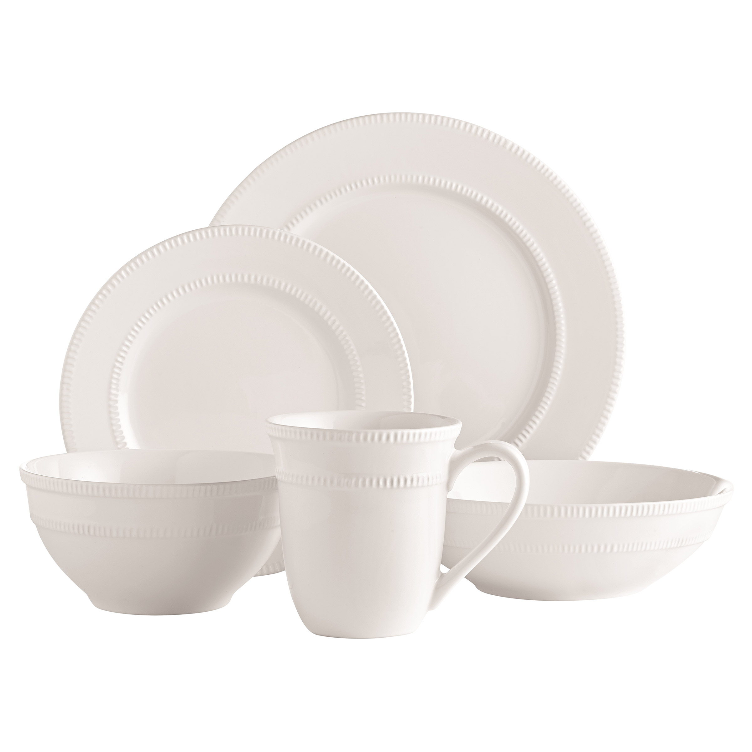 Creamy white dinnerware with imprinted borders create a rustic vibe while still keeping it classic. The generously sized pieces allow for plentiful portion of your favorite food and drink. This 40 Piece Dinnerware Set, Service for 8, includes 8 dinner plates, 8 salad plates, 8 soup bowls, 8 cereal bowls and 8 mugs