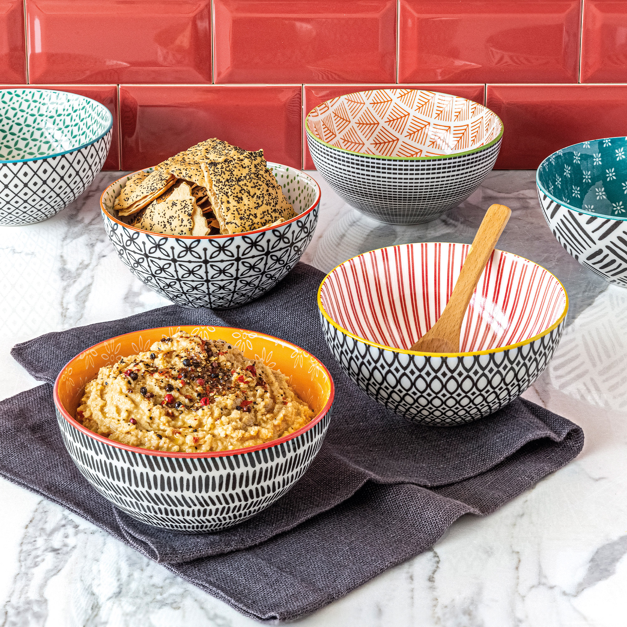 Present your delicious preparations in the overandback Geometry 6-piece All-Purpose Bowl Set in colorful mix and match designs. Constructed of fine stoneware, these beautiful bowls offer a crisp and graceful silhouette to each and every meal. These bowls are ideal for snacks, candy, dips and so much more. Perfect for small and large gatherings, as well as for everyday use. Microwave safe for quick and easy reheating. Dishwasher safe for easy cleaning.