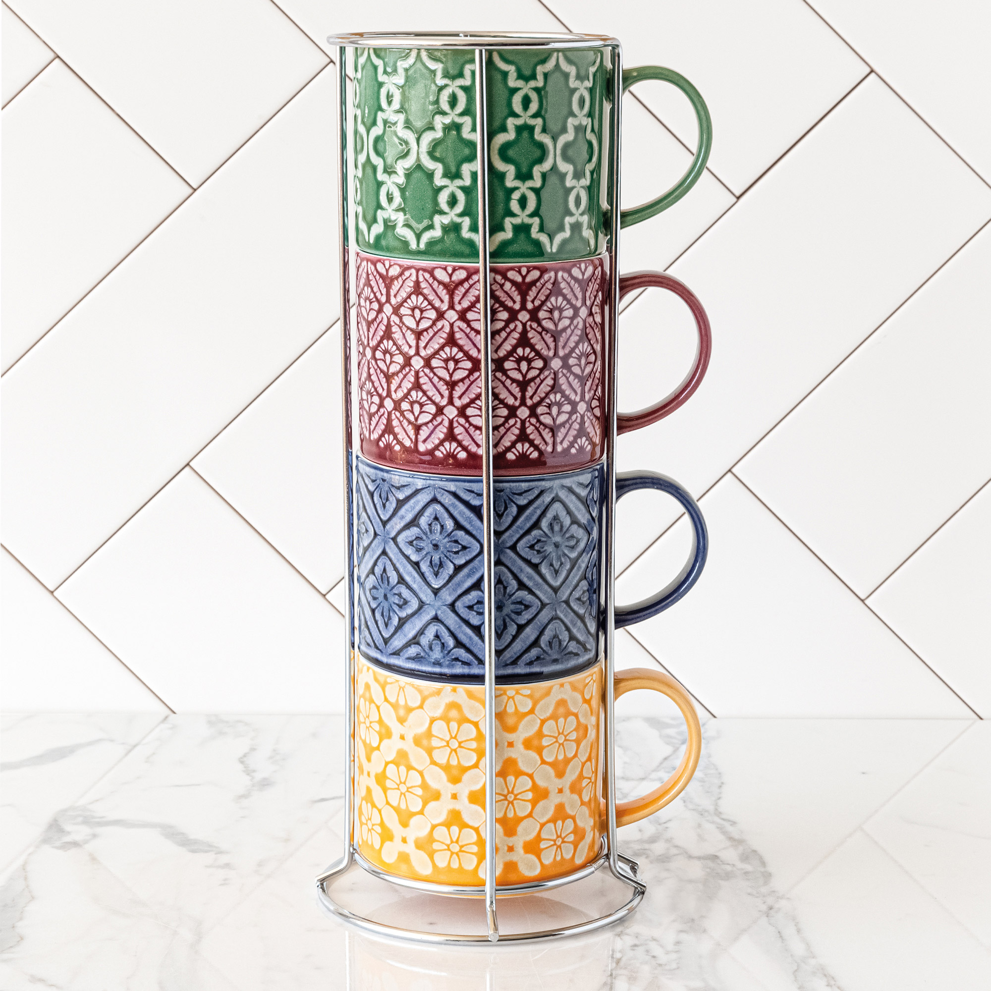 Overandback has the perfect set of mugs for you, in 2 color options depending on whether your style is bold and bright or neutral and understated. These sturdy stoneware mugs come in four different but complimentary patterns, created using a wax-resistant glaze to give a textured finish. Mugs can be conveniently stacked and stored in the metal storage rack